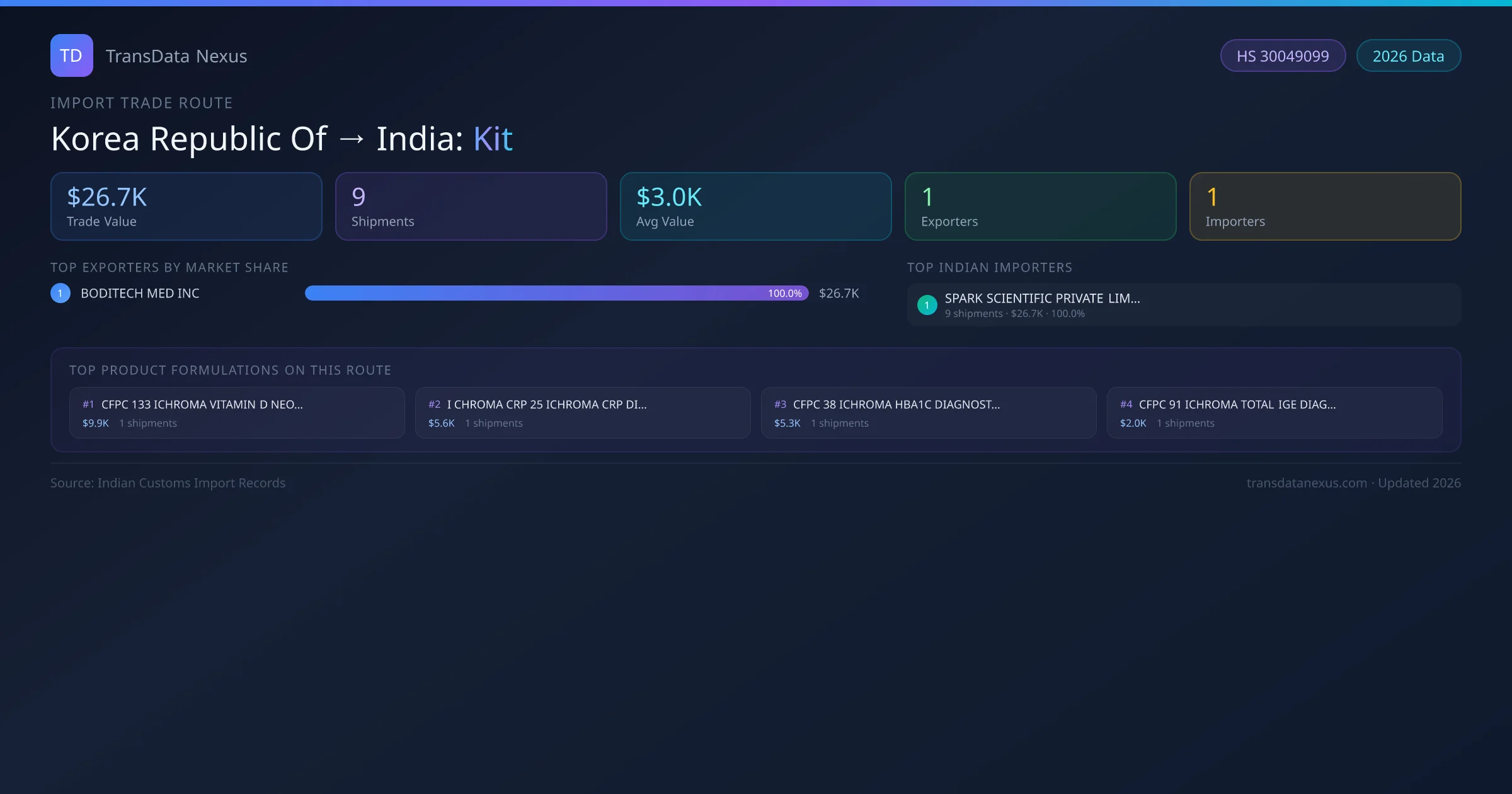 The Korea Republic Of to India Kit corridor is one of India's established pharmaceutical import routes from Korea Republic Of, with 9 shipments documented worth a combined $26.7K USD. The route is dominated by BODITECH MED INC , which alone accounts for roughly 100% of all import value, reflecting the consolidated nature of Korea Republic Of's kit export sector.