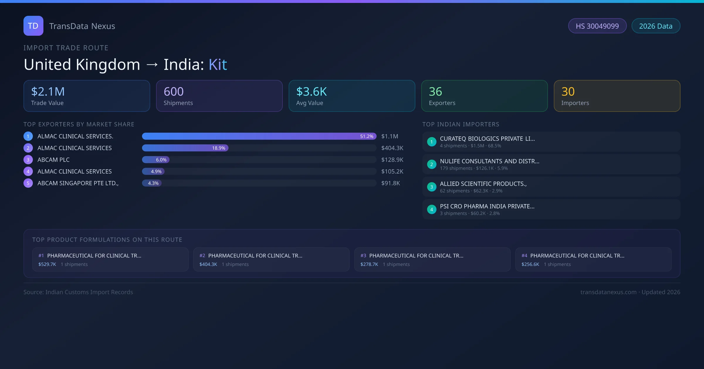 India has recorded 600 verified shipments of Kit imported from United Kingdom, representing a combined trade value of $2.1M USD. This corridor is served by 36 active United Kingdom exporters, with an average shipment value of $3.6K USD. The leading United Kingdom supplier is ALMAC CLINICAL SERVICES., which accounts for 51% of total import value with 4 shipments worth $1.1M USD. On the buying side, CURATEQ BIOLOGICS PRIVATE LIMITED is the largest Indian importer with $1.5M USD in purchases. The top 3 suppliers — ALMAC CLINICAL SERVICES., ALMAC CLINICAL SERVICES , ABCAM PLC — together control 76% of total trade value on this route. All data sourced from Indian Customs (DGFT) shipping bill of entry records. Values reported in FOB USD.