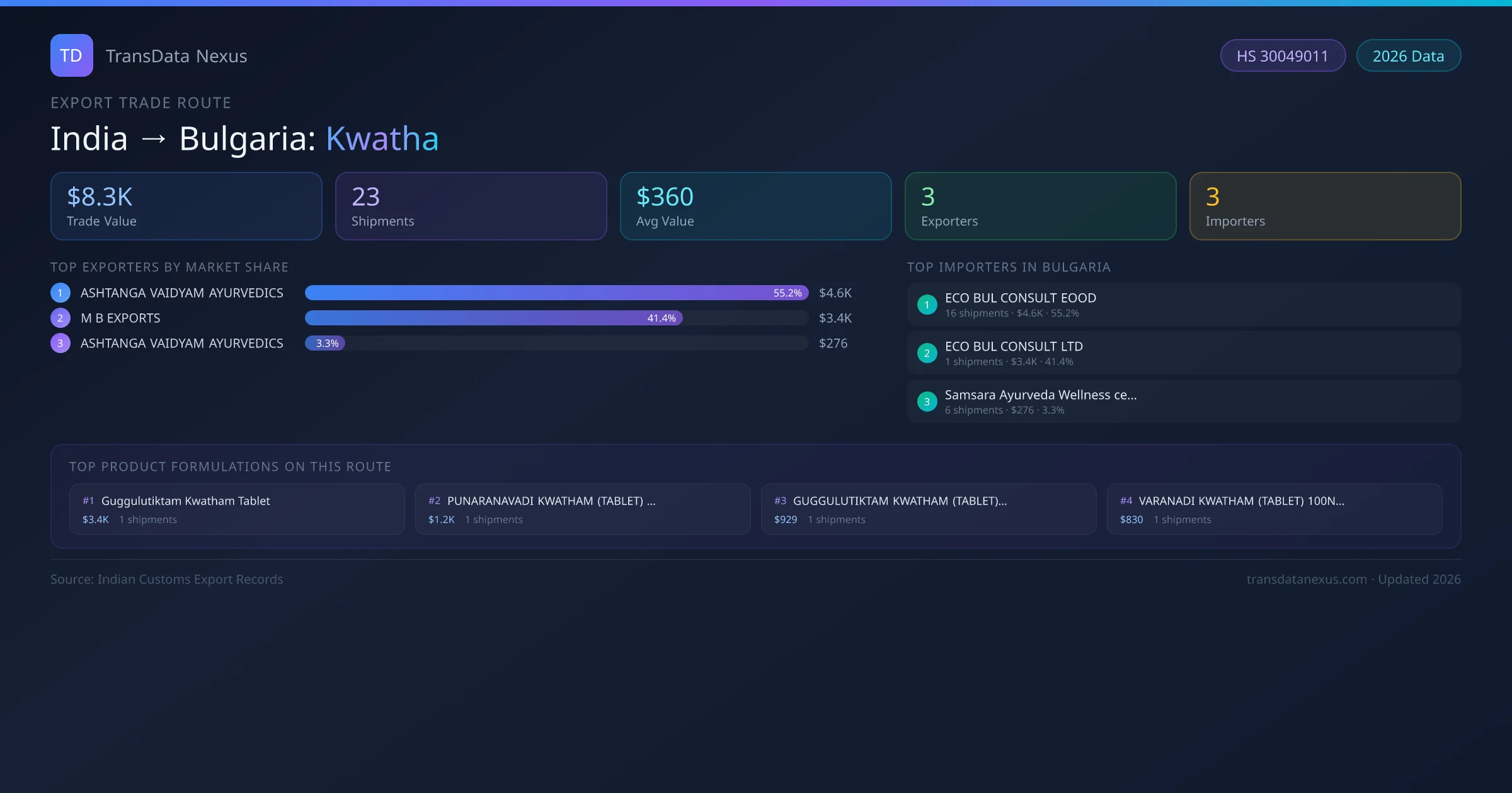 The India to Bulgaria Kwatha corridor is one of India's established pharmaceutical export routes, with 23 shipments documented worth a combined $8.3K USD. The route is dominated by ASHTANGA VAIDYAM AYURVEDICS , which alone accounts for roughly 55% of all export value, reflecting the consolidated nature of India's kwatha manufacturing sector.