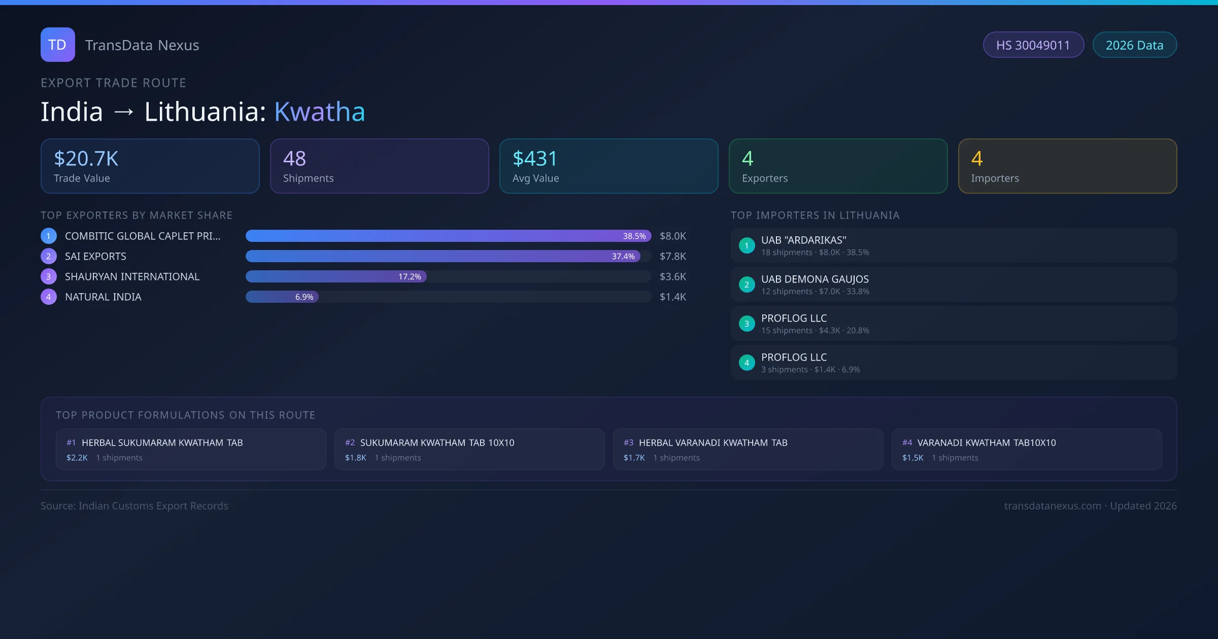 The India to Lithuania Kwatha corridor is one of India's established pharmaceutical export routes, with 48 shipments documented worth a combined $20.7K USD. The route is dominated by COMBITIC GLOBAL CAPLET PRIVATE LIMITED, which alone accounts for roughly 38% of all export value, reflecting the consolidated nature of India's kwatha manufacturing sector.