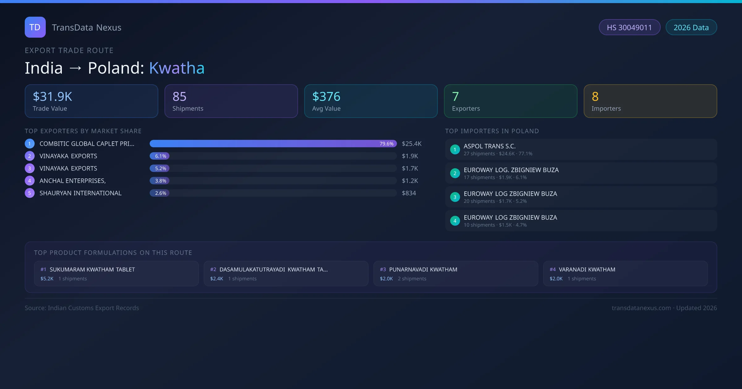 India has recorded 85 verified shipments of Kwatha exported to Poland, representing a combined trade value of $31.9K USD. This corridor is served by 7 active Indian exporters, with an average shipment value of $376 USD. The leading Indian exporter is COMBITIC GLOBAL CAPLET PRIVATE LIMITED , which accounts for 80% of total export value with 30 shipments worth $25.4K USD. On the buying side, ASPOL TRANS S.C. is the largest importer in Poland with $24.6K USD in purchases. The top 3 suppliers — COMBITIC GLOBAL CAPLET PRIVATE LIMITED , VINAYAKA EXPORTS , VINAYAKA EXPORTS — together control 91% of total trade value on this route. All data sourced from Indian Customs (DGFT) shipping bill records. Values reported in FOB USD.