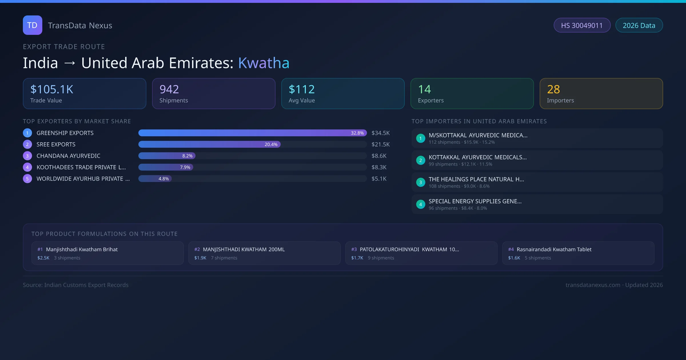 The leading Indian exporters of Kwatha to United Arab Emirates are GREENSHIP EXPORTS, SREE EXPORTS, CHANDANA AYURVEDIC. GREENSHIP EXPORTS holds the largest market share at approximately 33% of total trade value on this route.