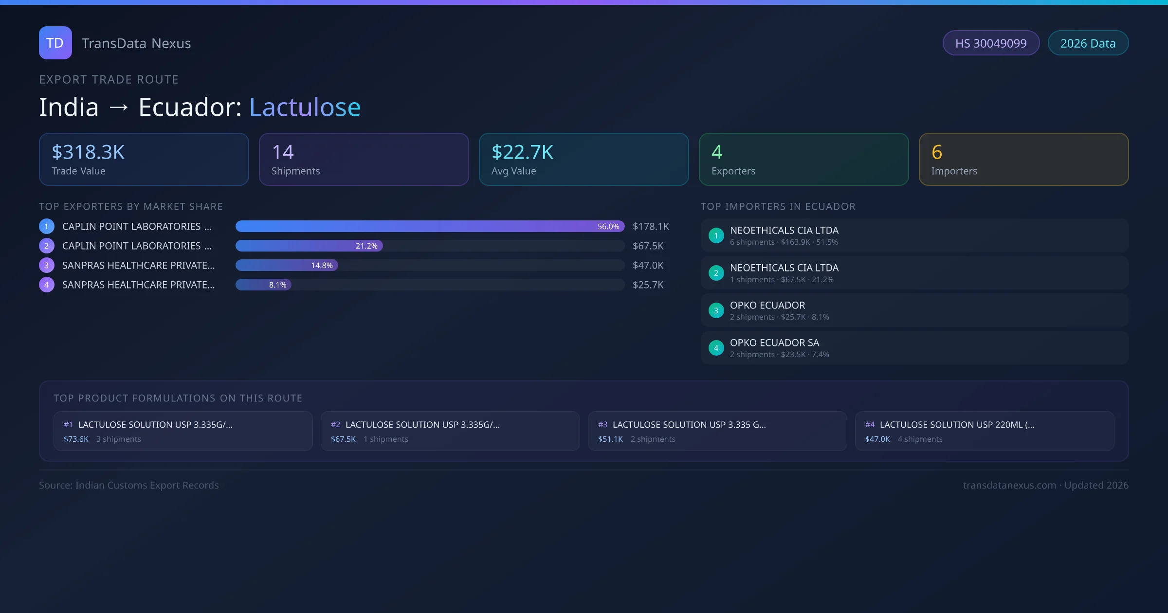 The India to Ecuador Lactulose corridor is one of India's established pharmaceutical export routes, with 14 shipments documented worth a combined $318.3K USD. The route is dominated by CAPLIN POINT LABORATORIES LIMITED, which alone accounts for roughly 56% of all export value, reflecting the consolidated nature of India's lactulose manufacturing sector.