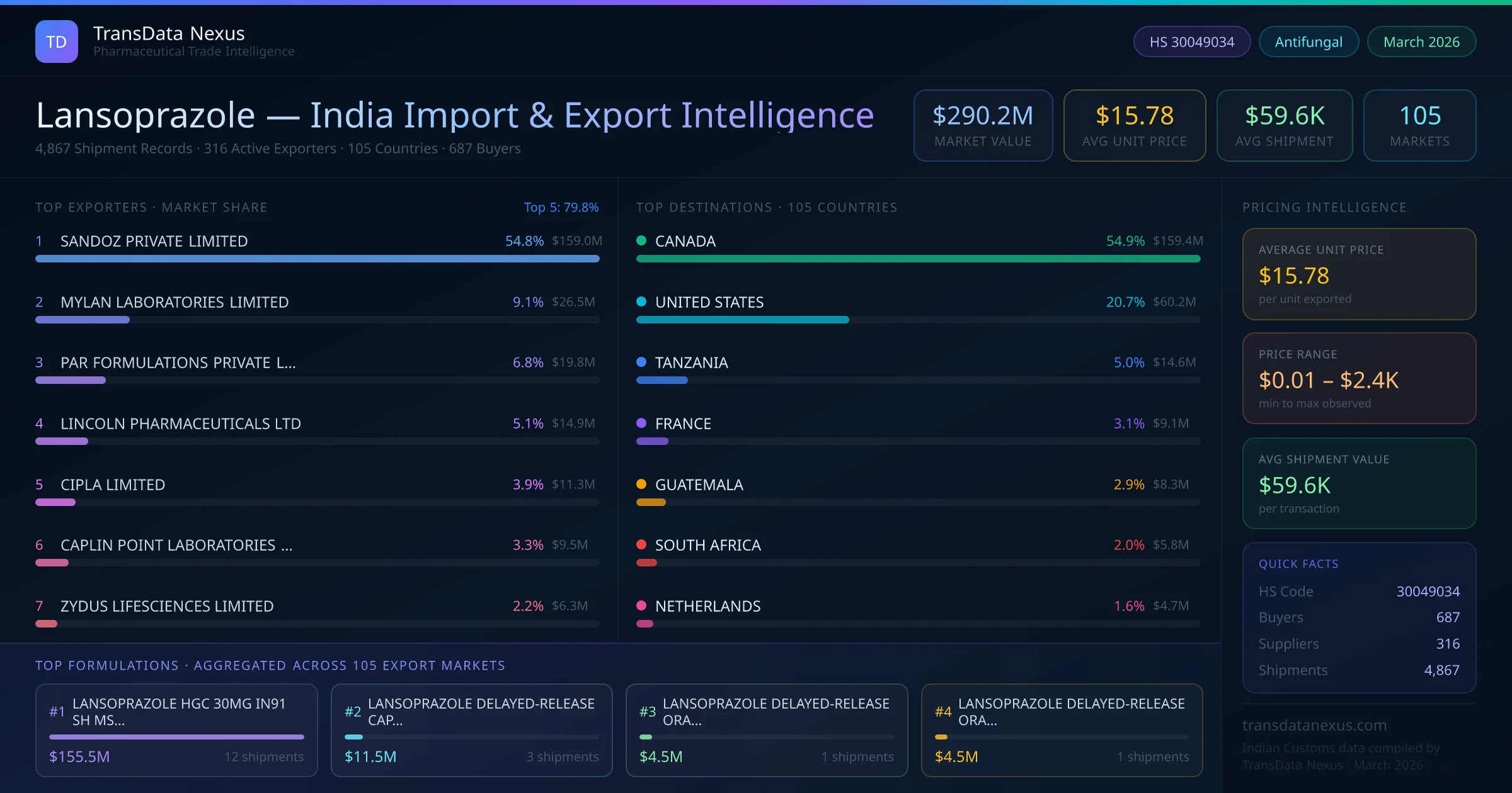 Between 2022 and 2026, India exported $290.2M worth of lansoprazole across 4,867 verified shipments to 105 countries — covering 54% of world markets in the Gastrointestinal segment. The largest destination is CANADA (54.9%). SANDOZ PRIVATE LIMITED leads with a 54.8% share. All figures are drawn from Indian Customs (DGFT) shipping bill records spanning four years of trade activity.