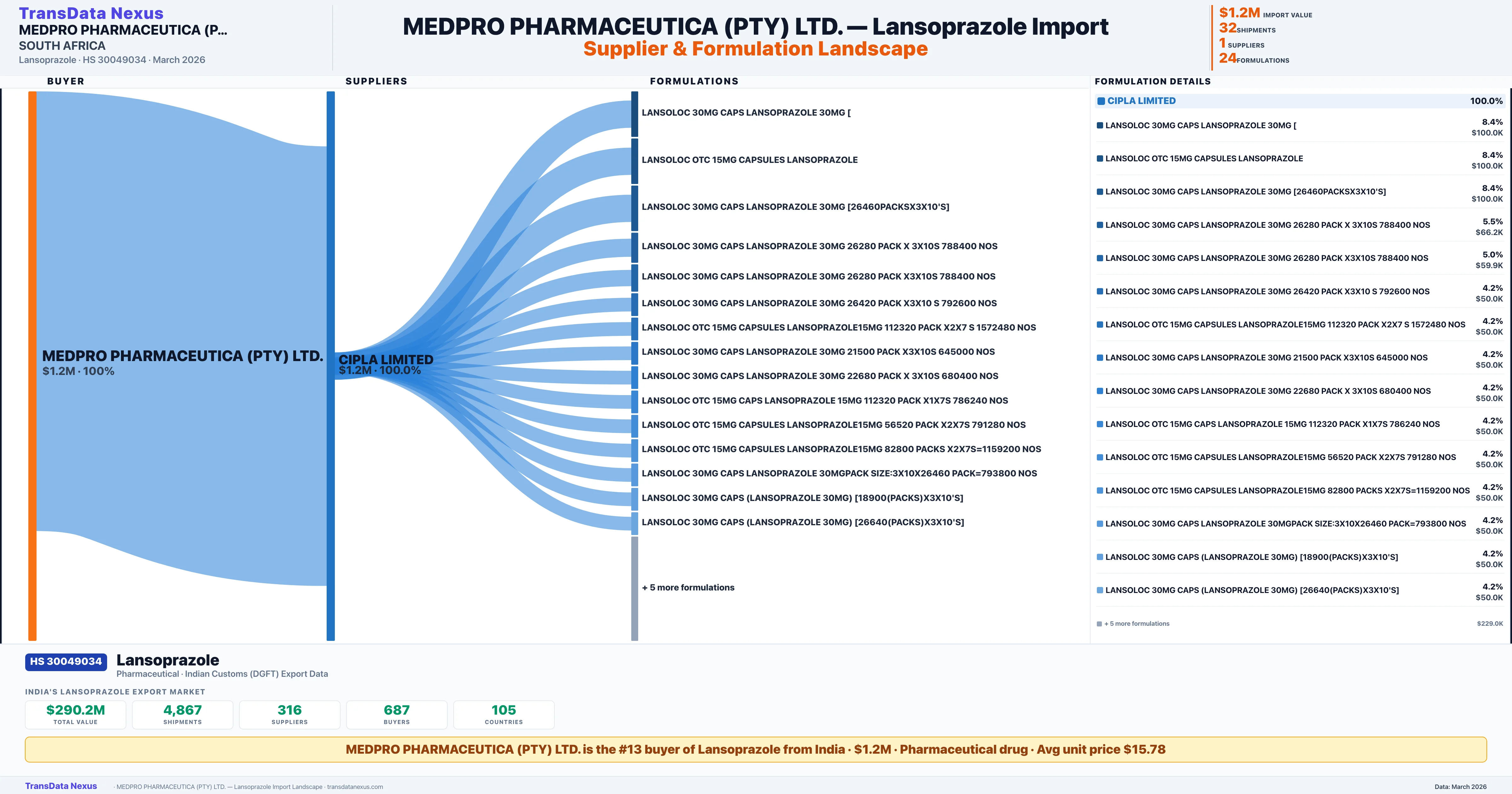 MEDPRO PHARMACEUTICA (PTY) LTD. sources Lansoprazole from 1 verified Indian supplier based on 32 customs records. The primary supplier is CIPLA LIMITED accounting for 100.0% of imports.