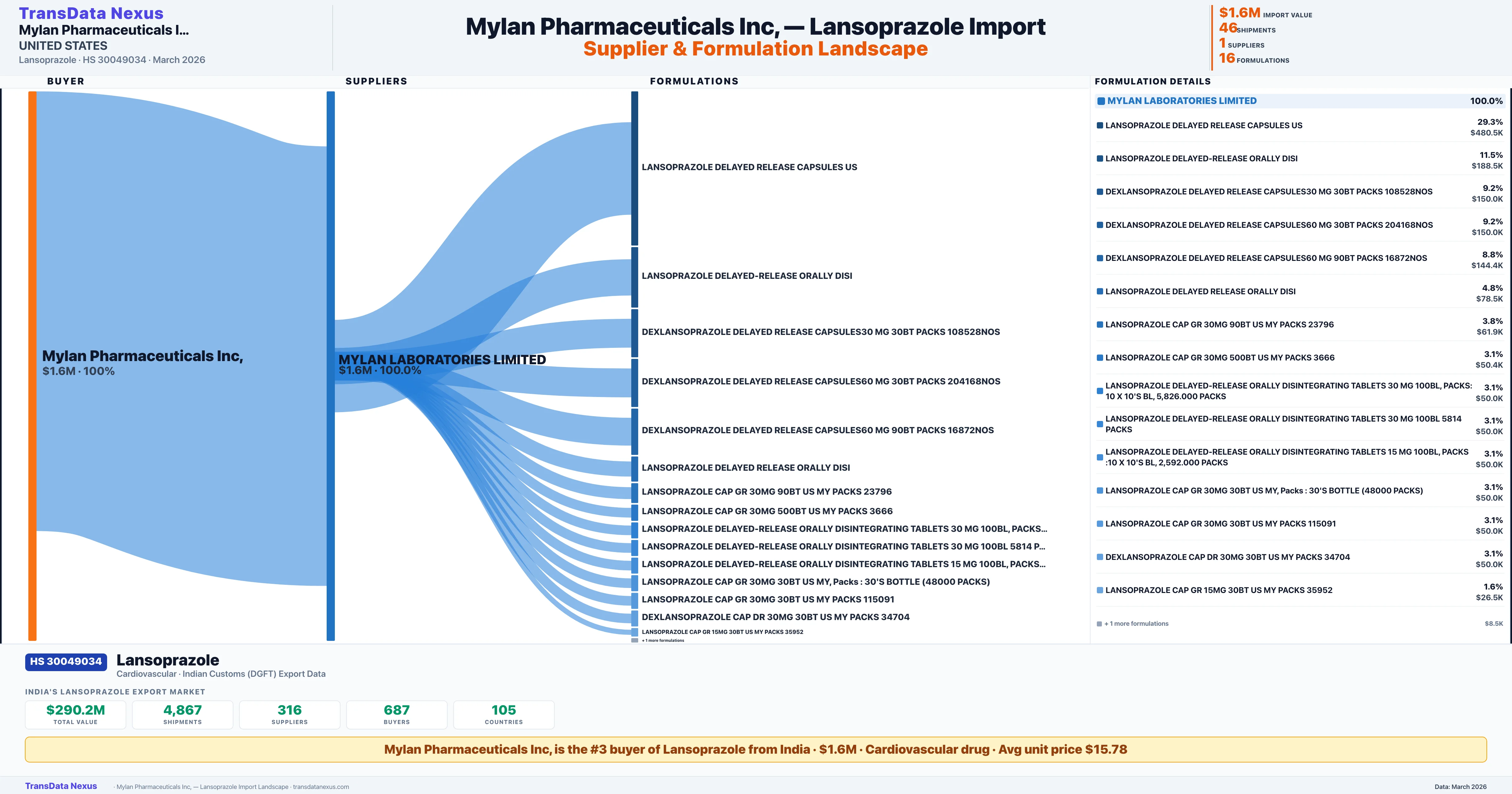 - 5.Verified Records: This page is backed by 46 individual customs records matching MYLAN PHARMACEUTICALS INC, importing Lansoprazole, covering 16 formulations from 1 verified supplier.