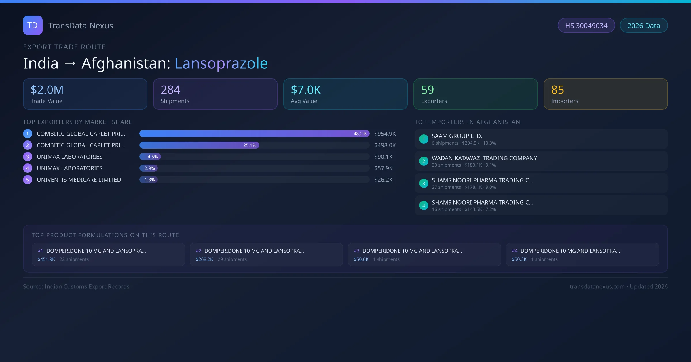 India has recorded 284 verified shipments of Lansoprazole exported to Afghanistan, representing a combined trade value of $2.0M USD. This corridor is served by 59 active Indian exporters, with an average shipment value of $7.0K USD. The leading Indian exporter is COMBITIC GLOBAL CAPLET PRIVATE LIMITED, which accounts for 48% of total export value with 121 shipments worth $954.9K USD. On the buying side, SAAM GROUP LTD. is the largest importer in Afghanistan with $204.5K USD in purchases. The top 3 suppliers — COMBITIC GLOBAL CAPLET PRIVATE LIMITED, COMBITIC GLOBAL CAPLET PRIVATE LIMITED , UNIMAX LABORATORIES — together control 78% of total trade value on this route. All data sourced from Indian Customs (DGFT) shipping bill records. Values reported in FOB USD.