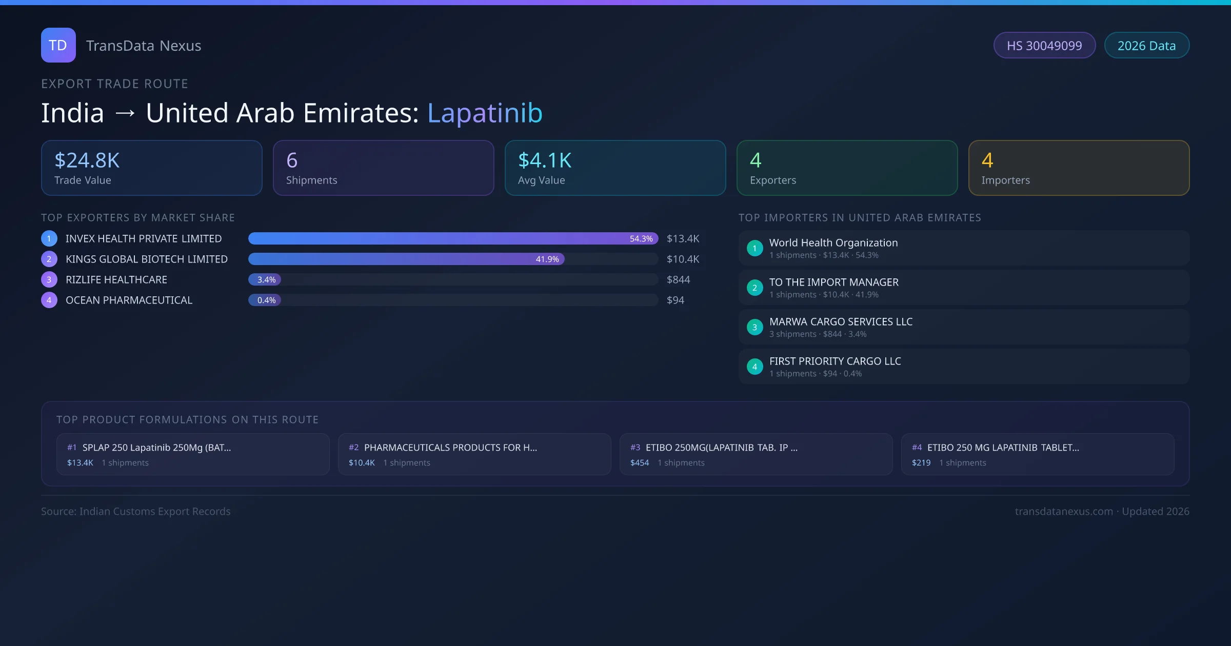 - 1.Route Identification: India to United Arab Emirates export trade corridor identified from Indian Customs (DGFT) records for Lapatinib.