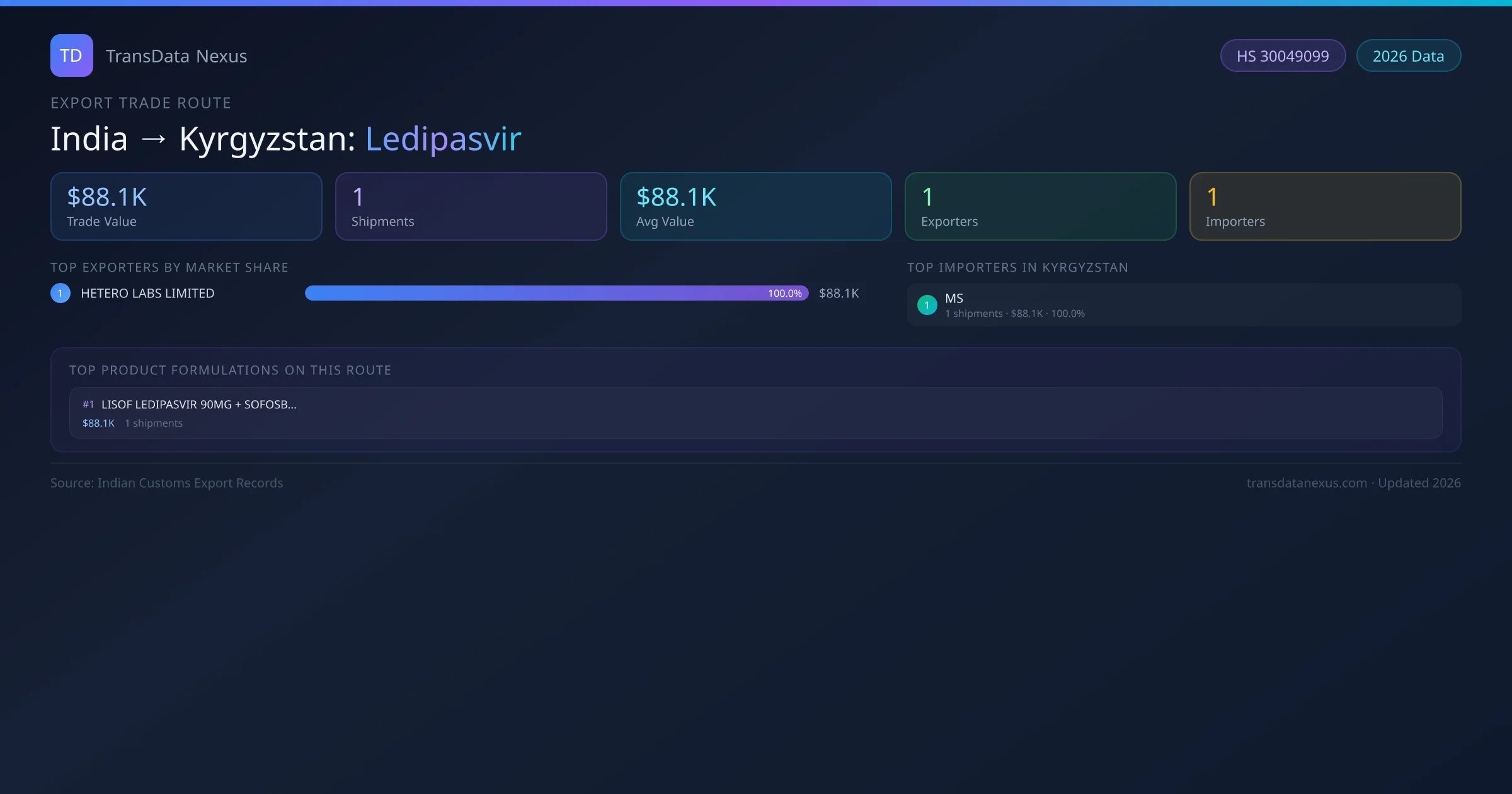 India has recorded 1 verified shipments of Ledipasvir exported to Kyrgyzstan, representing a combined trade value of $88.1K USD. This corridor is served by 1 active Indian exporters, with an average shipment value of $88.1K USD. The leading Indian exporter is HETERO LABS LIMITED, which accounts for 100% of total export value with 1 shipments worth $88.1K USD. On the buying side, MS is the largest importer in Kyrgyzstan with $88.1K USD in purchases. All data sourced from Indian Customs (DGFT) shipping bill records. Values reported in FOB USD.