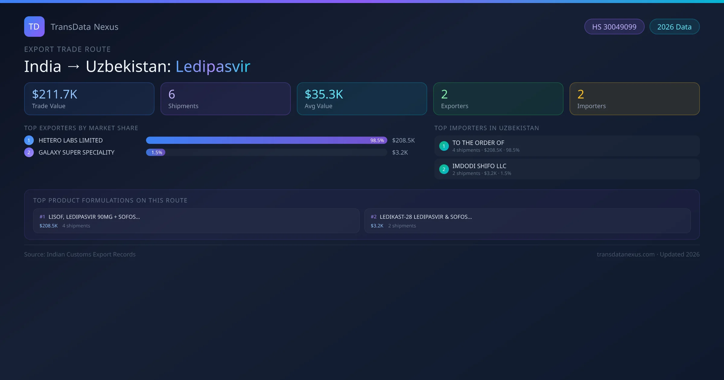 The India to Uzbekistan Ledipasvir corridor is one of India's established pharmaceutical export routes, with 6 shipments documented worth a combined $211.7K USD. The route is dominated by HETERO LABS LIMITED , which alone accounts for roughly 98% of all export value, reflecting the consolidated nature of India's ledipasvir manufacturing sector.