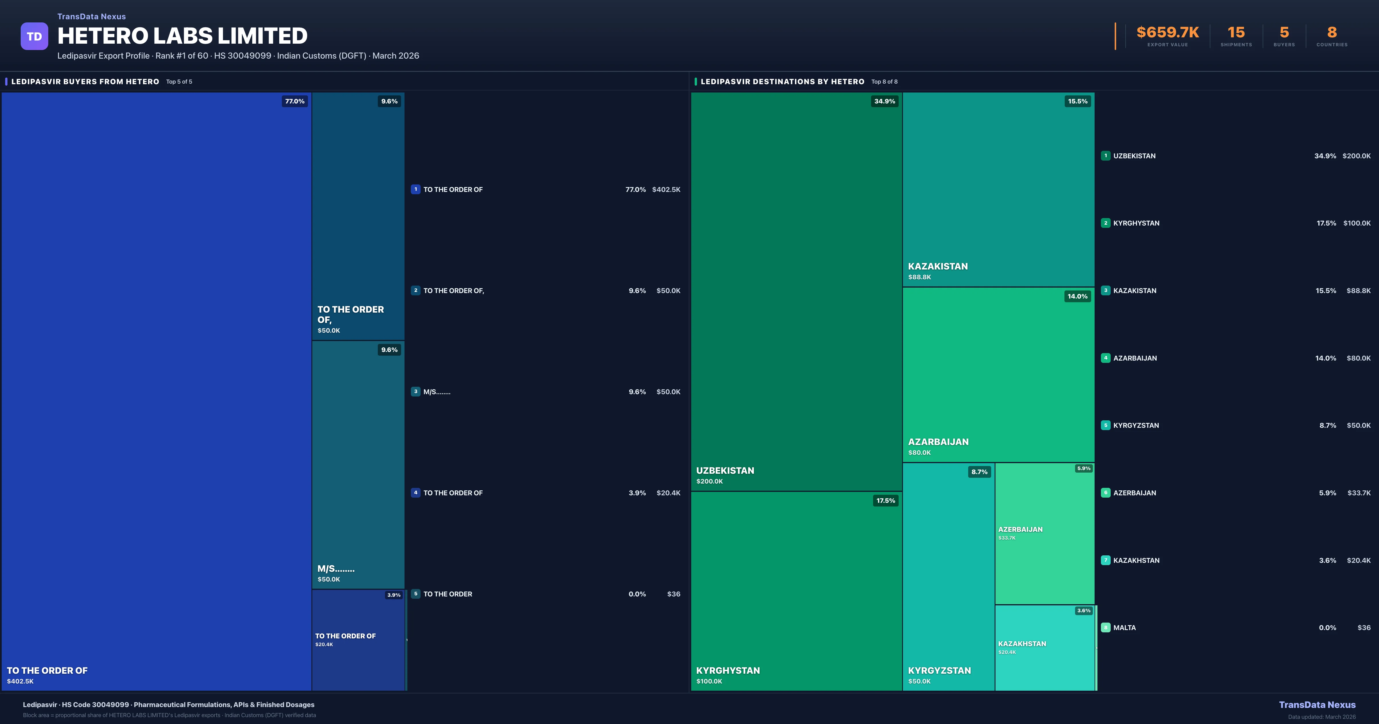 Hetero Labs Limited supplies Ledipasvir to 5 buyers globally. The largest buyer is TO THE ORDER OF (KAZAKISTAN), followed by TO THE ORDER OF, (KYRGHYSTAN) and M/S........ (KYRGHYSTAN). These buyers represent pharmaceutical distributors, hospital groups, and government procurement agencies in their respective markets.