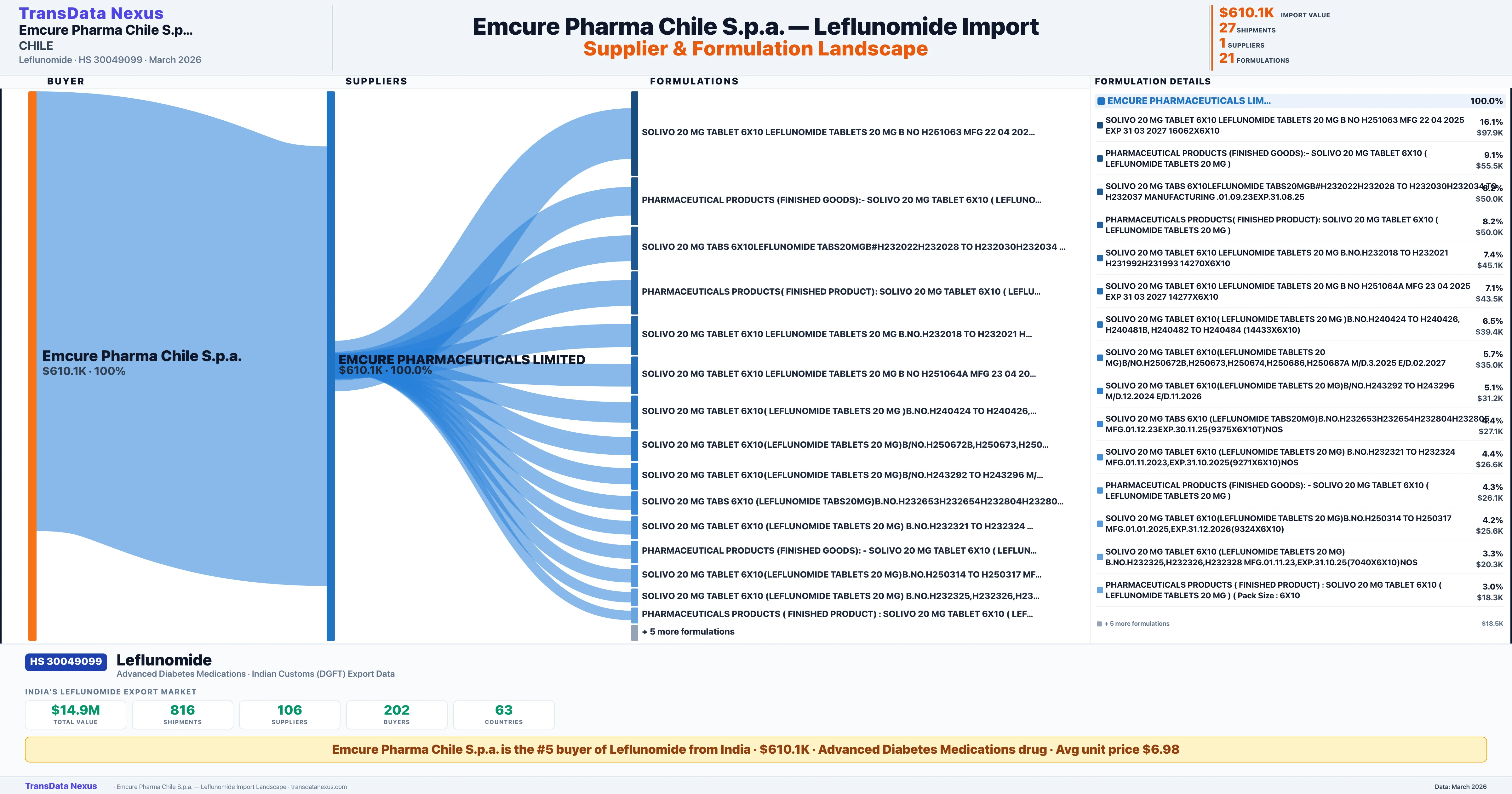 EMCURE PHARMA CHILE S.P.A. sources Leflunomide from 1 verified Indian supplier: EMCURE PHARMACEUTICALS LIMITED ($610.1K, 100.0%). This is based on 27 customs records.