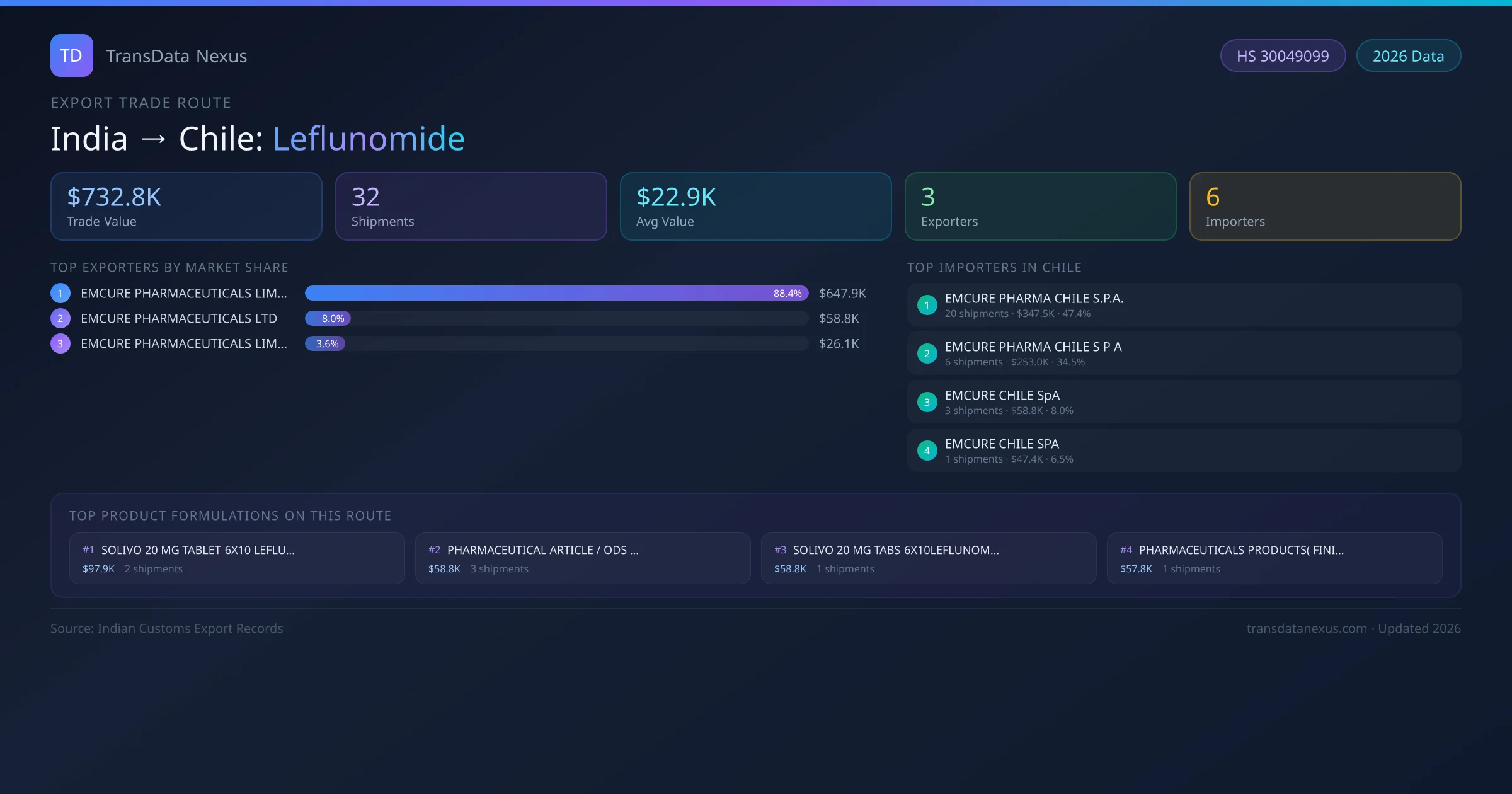 India has recorded 32 verified shipments of Leflunomide exported to Chile, representing a combined trade value of $732.8K USD. This corridor is served by 3 active Indian exporters, with an average shipment value of $22.9K USD. The leading Indian exporter is EMCURE PHARMACEUTICALS LIMITED, which accounts for 88% of total export value with 27 shipments worth $647.9K USD. On the buying side, EMCURE PHARMA CHILE S.P.A. is the largest importer in Chile with $347.5K USD in purchases. The top 3 suppliers — EMCURE PHARMACEUTICALS LIMITED, EMCURE PHARMACEUTICALS LTD, EMCURE PHARMACEUTICALS LIMITED — together control 100% of total trade value on this route. All data sourced from Indian Customs (DGFT) shipping bill records. Values reported in FOB USD.