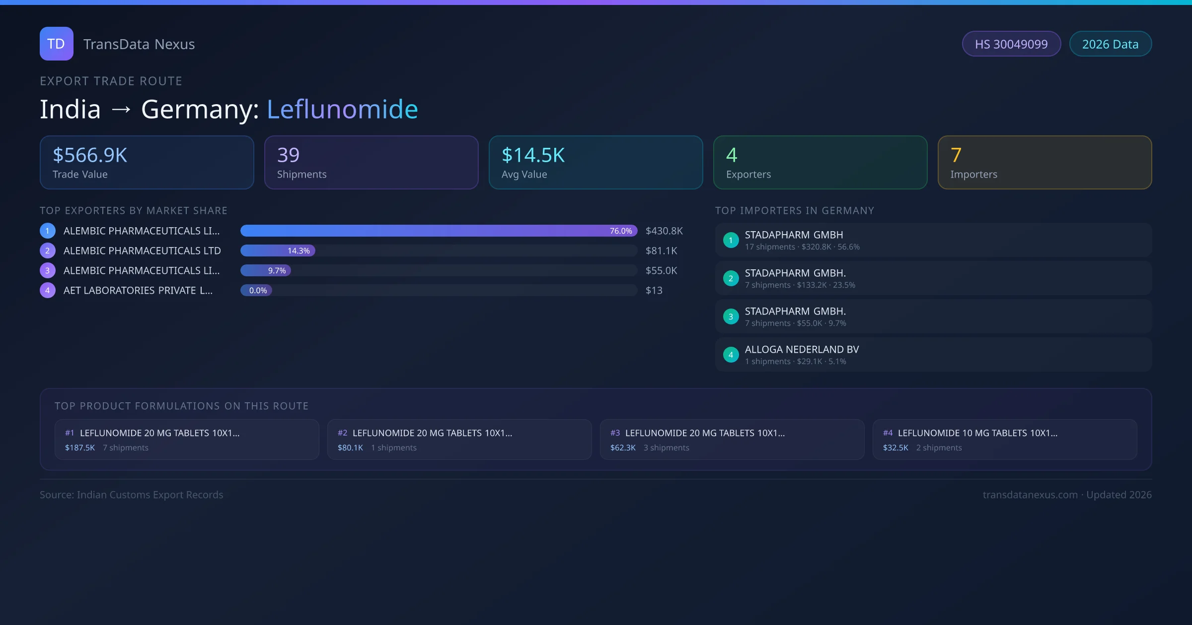India has recorded 39 verified shipments of Leflunomide exported to Germany, representing a combined trade value of $566.9K USD. This corridor is served by 4 active Indian exporters, with an average shipment value of $14.5K USD. The leading Indian exporter is ALEMBIC PHARMACEUTICALS LIMITED, which accounts for 76% of total export value with 22 shipments worth $430.8K USD. On the buying side, STADAPHARM GMBH is the largest importer in Germany with $320.8K USD in purchases. The top 3 suppliers — ALEMBIC PHARMACEUTICALS LIMITED, ALEMBIC PHARMACEUTICALS LTD, ALEMBIC PHARMACEUTICALS LIMITED — together control 100% of total trade value on this route. All data sourced from Indian Customs (DGFT) shipping bill records. Values reported in FOB USD.