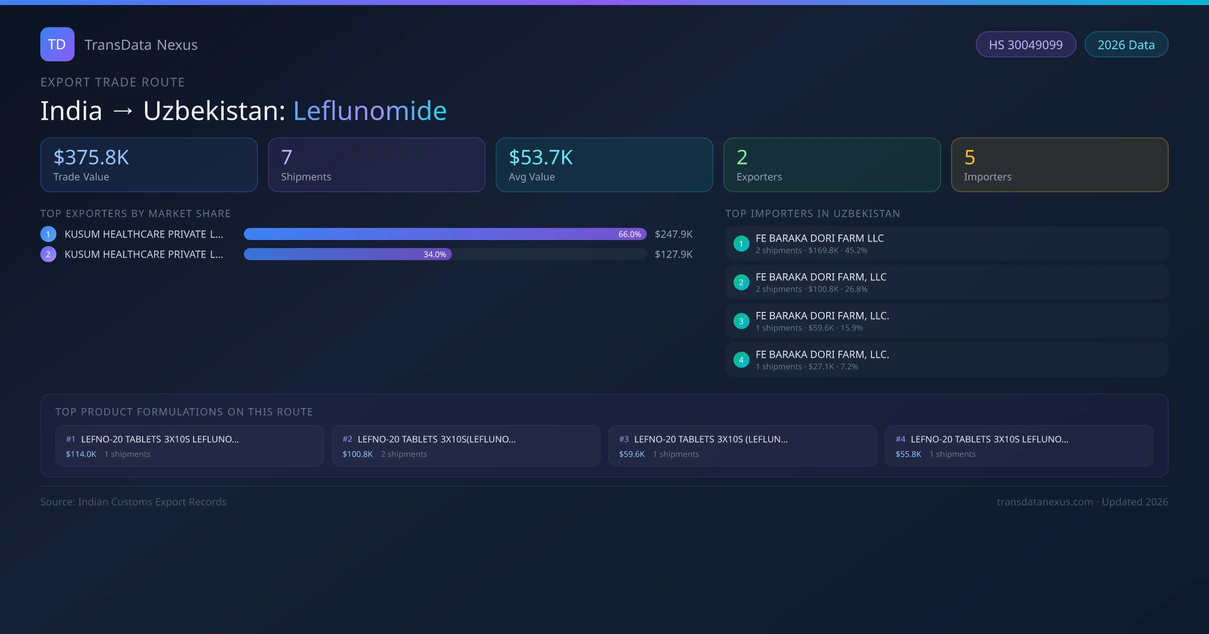 India has recorded 7 verified shipments of Leflunomide exported to Uzbekistan, representing a combined trade value of $375.8K USD. This corridor is served by 2 active Indian exporters, with an average shipment value of $53.7K USD. The leading Indian exporter is KUSUM HEALTHCARE PRIVATE LIMITED, which accounts for 66% of total export value with 4 shipments worth $247.9K USD. On the buying side, FE BARAKA DORI FARM LLC is the largest importer in Uzbekistan with $169.8K USD in purchases. All data sourced from Indian Customs (DGFT) shipping bill records. Values reported in FOB USD.
