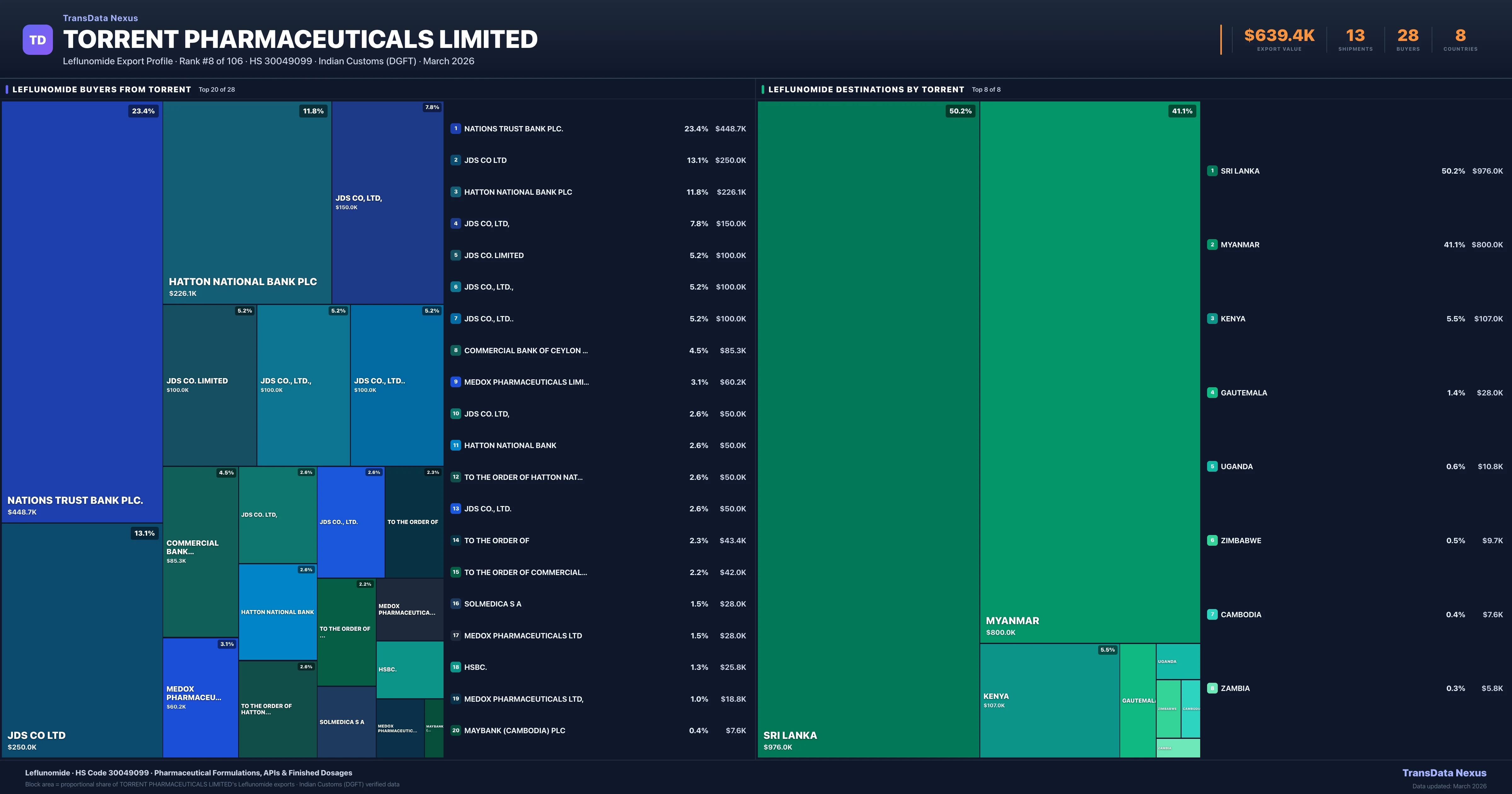 Torrent Pharmaceuticals Limited supplies Leflunomide to 28 buyers globally. The largest buyer is NATIONS TRUST BANK PLC. (SRI LANKA), followed by JDS CO LTD (MYANMAR) and HATTON NATIONAL BANK PLC (SRI LANKA). These buyers represent pharmaceutical distributors, hospital groups, and government procurement agencies in their respective markets.