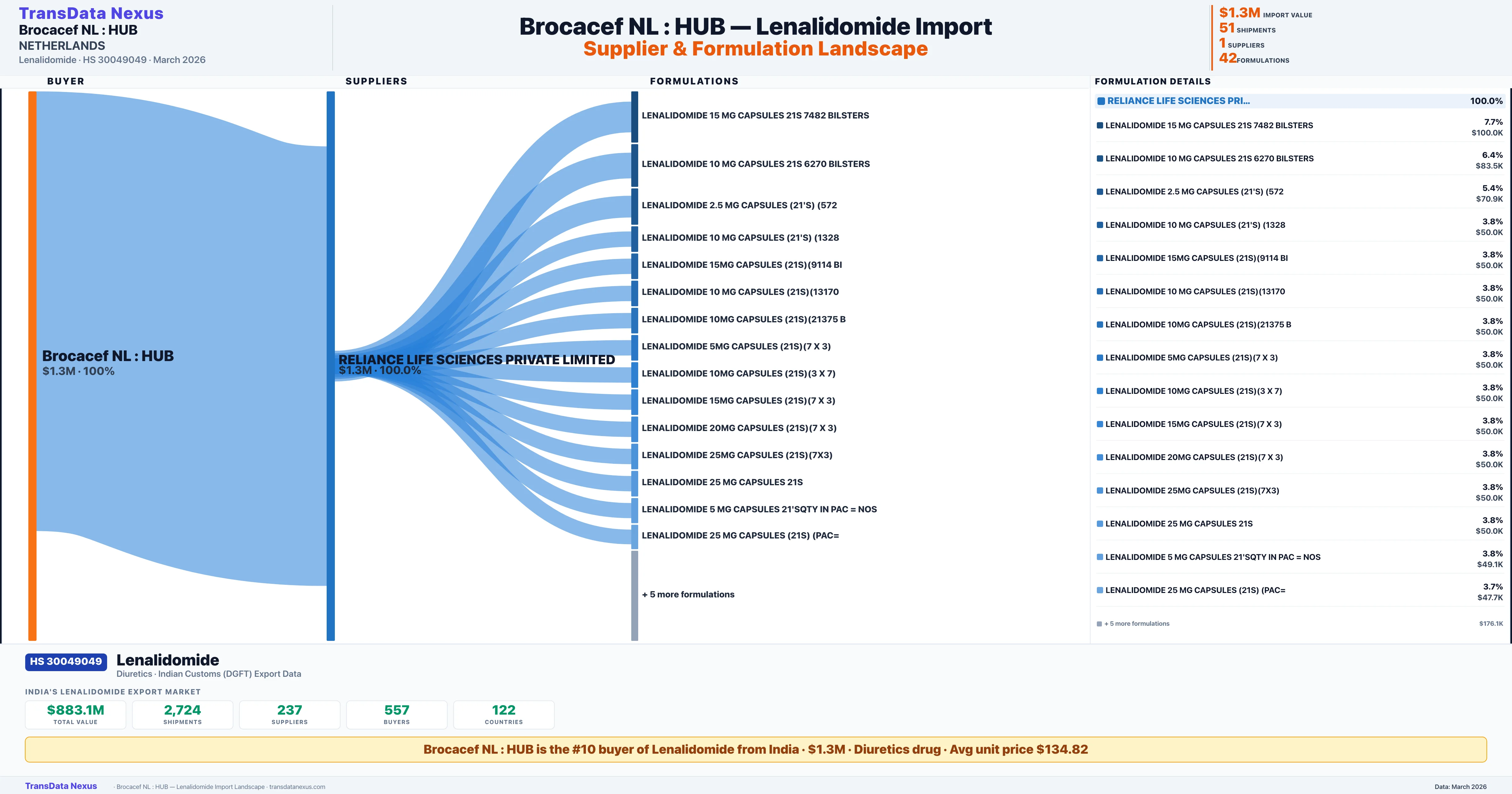 BROCACEF NL HUB sources Lenalidomide from 1 verified Indian supplier: RELIANCE LIFE SCIENCES PRIVATE LIMITED ($1.3M, 100.0%). This is based on 51 customs records.