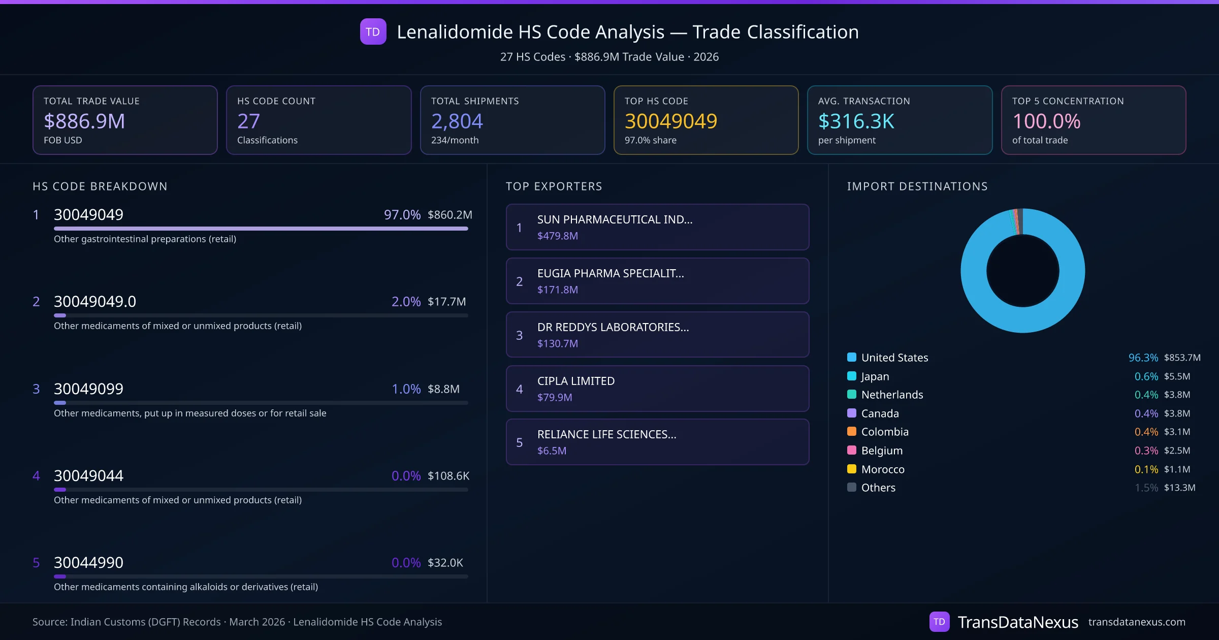 India exports Lenalidomide under 27 distinct HS code classifications, representing a total trade value of $886.9M across 2,804 shipments. The dominant classification is HS 30049049 (Other gastrointestinal preparations (retail)), accounting for 97.0% of all Lenalidomide trade at $860.2M. HS 30049049.0 (Other medicaments of mixed or unmixed products (retail)) follows at 2.0% ($17.7M). The top 5 HS codes together account for 100.0% of total Lenalidomide trade from India. The average transaction value is $316302. Key importing markets include United States, Japan, Netherlands. Leading exporters include SUN PHARMACEUTICAL INDUSTRIES LIMITED and EUGIA PHARMA SPECIALITIES LIMITED. Data sourced from Indian Customs (DGFT) shipping bill records.