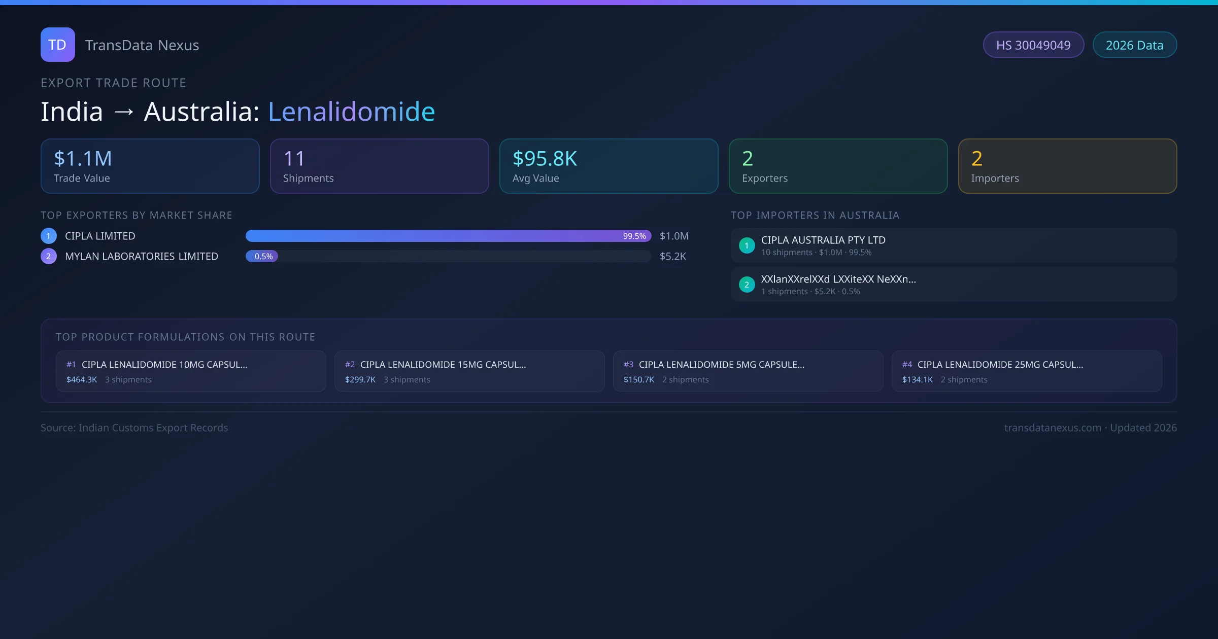 The India to Australia Lenalidomide corridor is one of India's established pharmaceutical export routes, with 11 shipments documented worth a combined $1.1M USD. The route is dominated by CIPLA LIMITED , which alone accounts for roughly 100% of all export value, reflecting the consolidated nature of India's lenalidomide manufacturing sector.