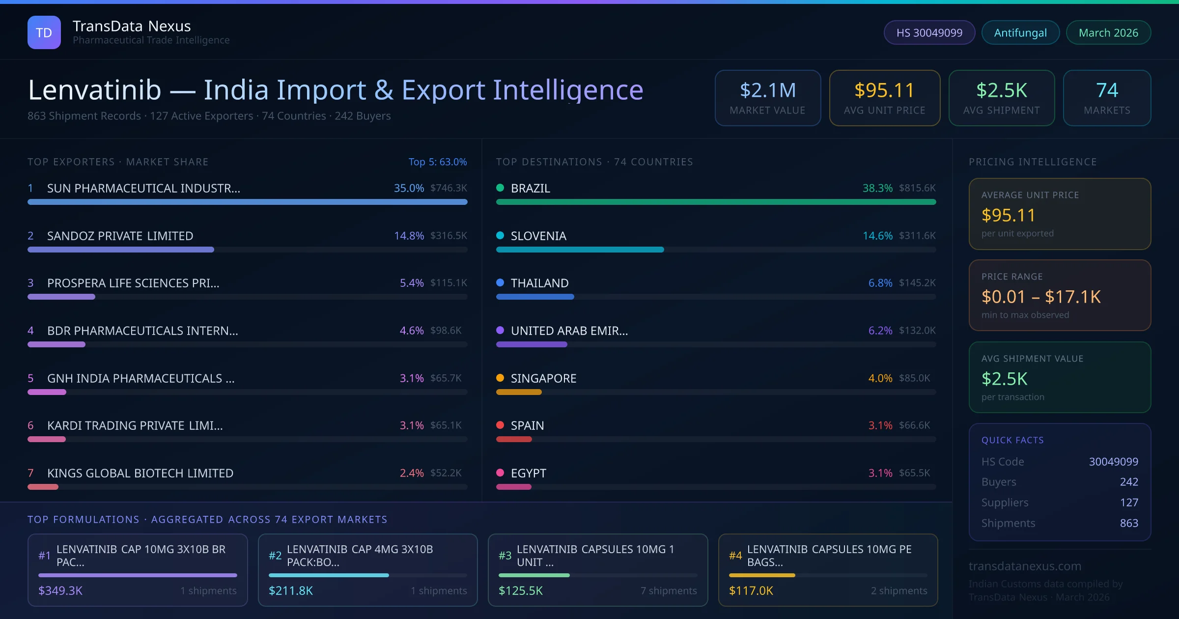 Between 2022 and 2026, India exported $2.1M worth of lenvatinib across 863 verified shipments to 74 countries — covering 38% of world markets in the Advanced Oncology segment. The largest destination is BRAZIL (38.3%). SUN PHARMACEUTICAL INDUSTRIES LIMITED leads with a 35.0% share. All figures are drawn from Indian Customs (DGFT) shipping bill records spanning four years of trade activity.