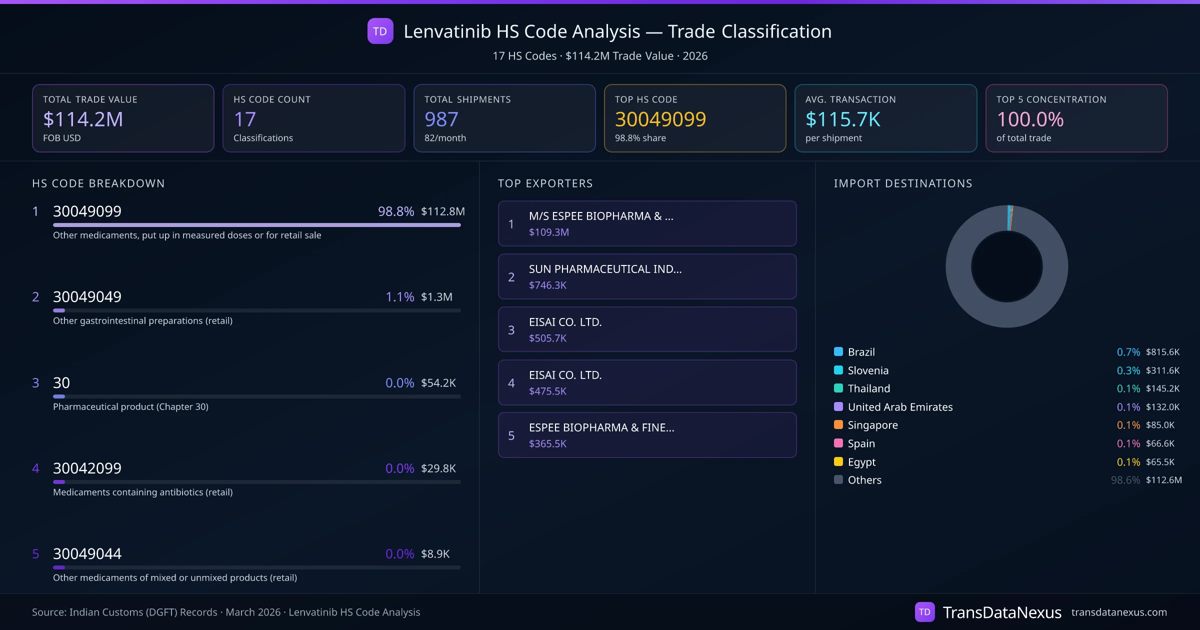 India exports Lenvatinib under 17 distinct HS code classifications, representing a total trade value of $114.2M across 987 shipments. The dominant classification is HS 30049099 (Other medicaments, put up in measured doses or for retail sale), accounting for 98.8% of all Lenvatinib trade at $112.8M. HS 30049049 (Other gastrointestinal preparations (retail)) follows at 1.1% ($1.3M). The top 5 HS codes together account for 100.0% of total Lenvatinib trade from India. The average transaction value is $115729. Key importing markets include Brazil, Slovenia, Thailand. Leading exporters include M/S ESPEE BIOPHARMA & FINECHEM LLC and SUN PHARMACEUTICAL INDUSTRIES LIMITED. Data sourced from Indian Customs (DGFT) shipping bill records.