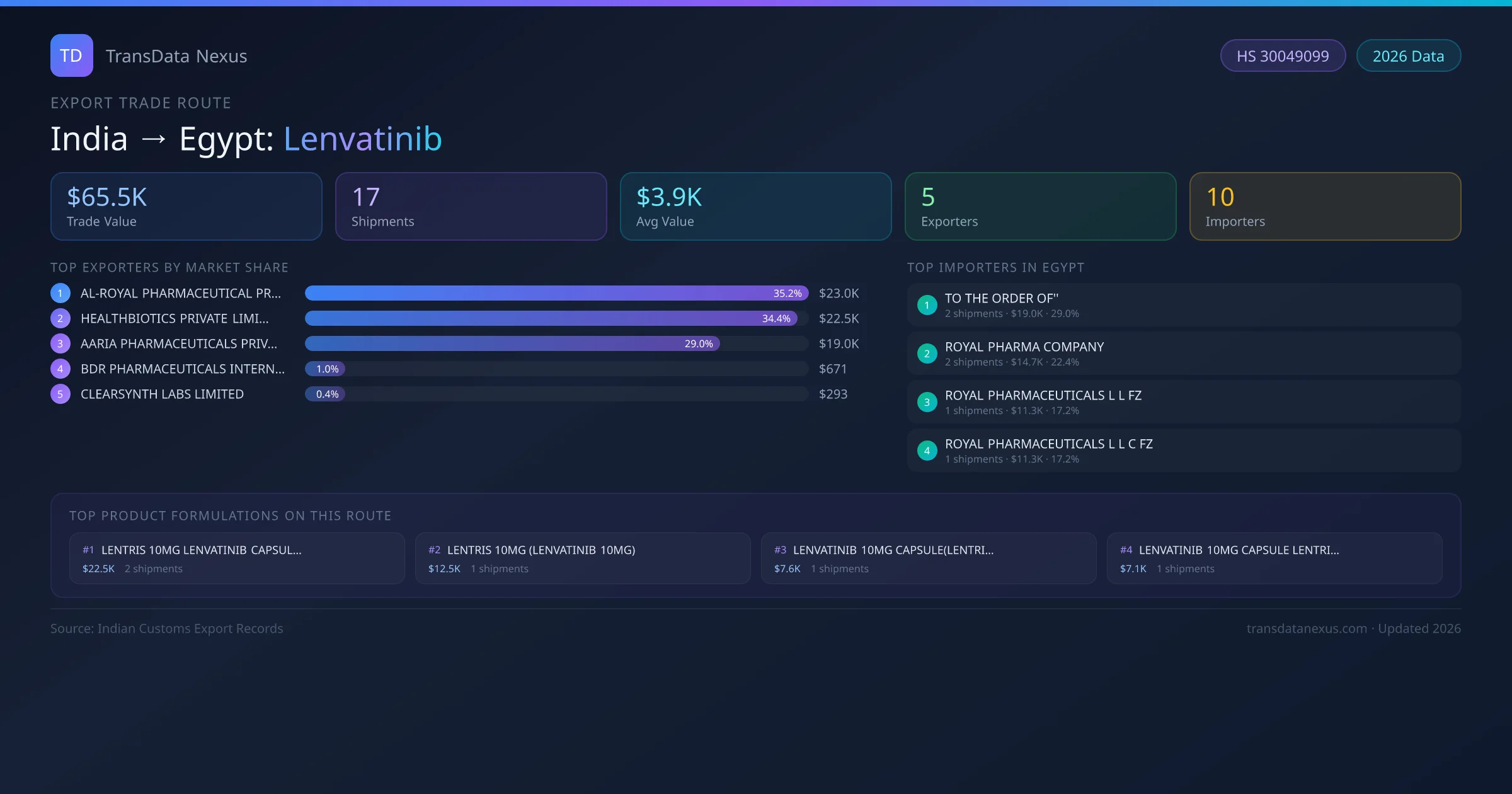 - 1.Route Identification: India to Egypt export trade corridor identified from Indian Customs (DGFT) records for Lenvatinib.
