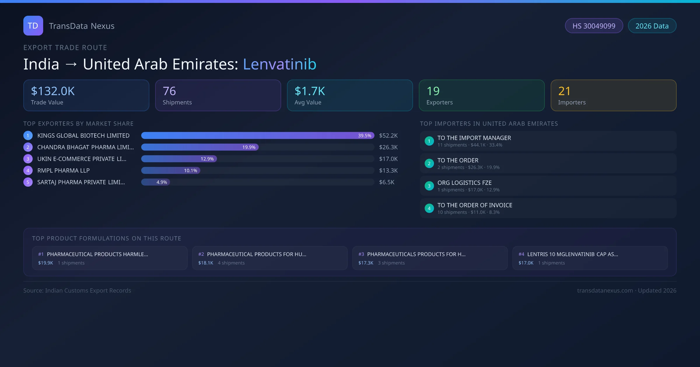 The India to United Arab Emirates Lenvatinib corridor is one of India's established pharmaceutical export routes, with 76 shipments documented worth a combined $132.0K USD. The route is dominated by KINGS GLOBAL BIOTECH LIMITED, which alone accounts for roughly 40% of all export value, reflecting the consolidated nature of India's lenvatinib manufacturing sector.