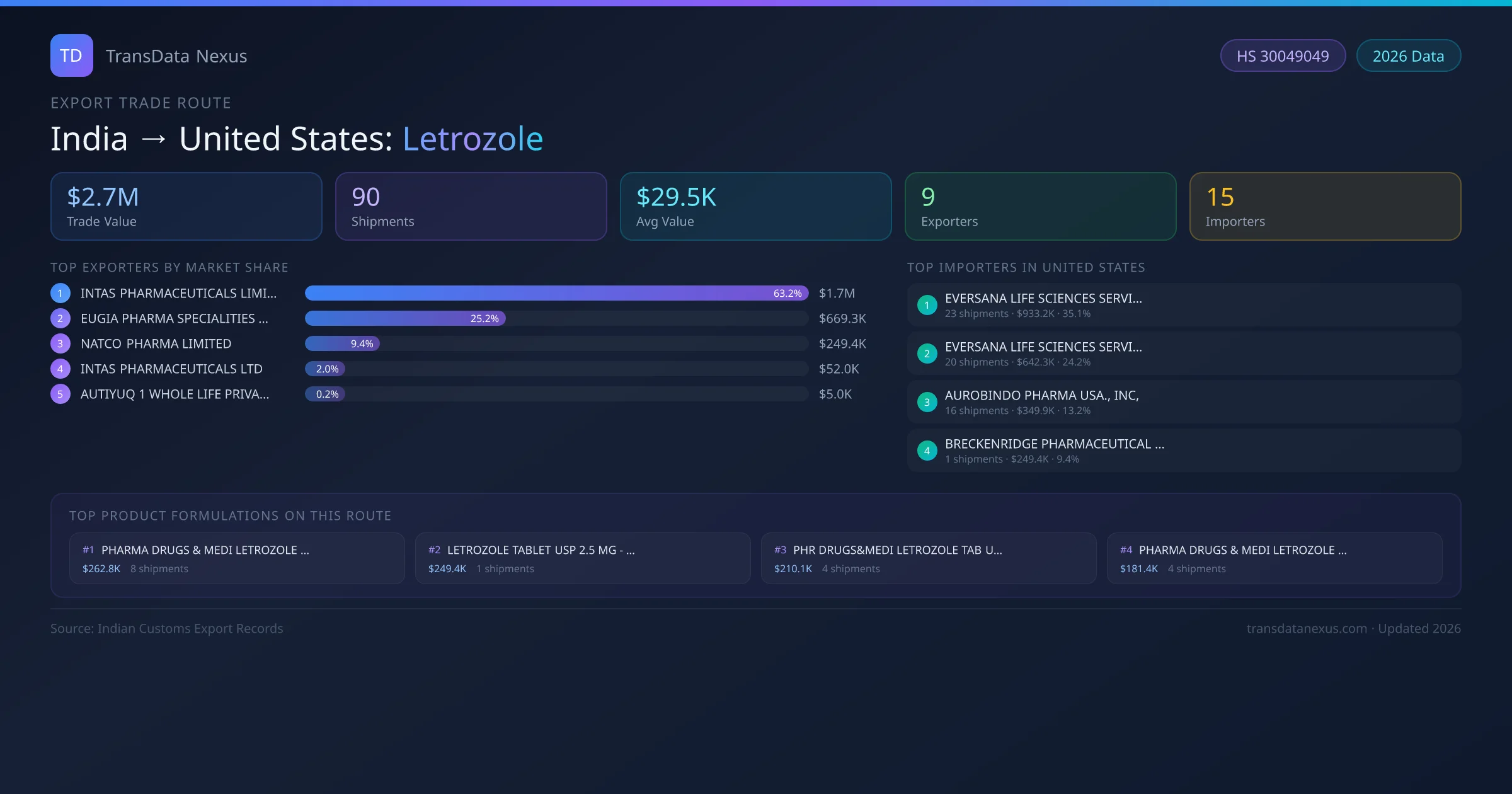 - 1.Route Identification: India to United States export trade corridor identified from Indian Customs (DGFT) records for Letrozole.