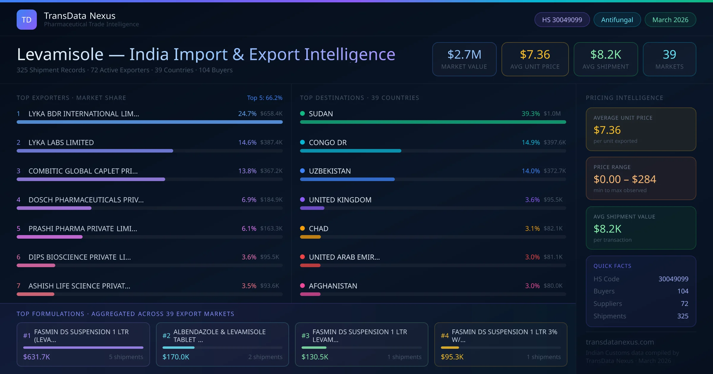 The average unit price for levamisole exports from India is $7.36 per unit, with prices ranging from $0.00 to $284.46 depending on formulation and order volume.