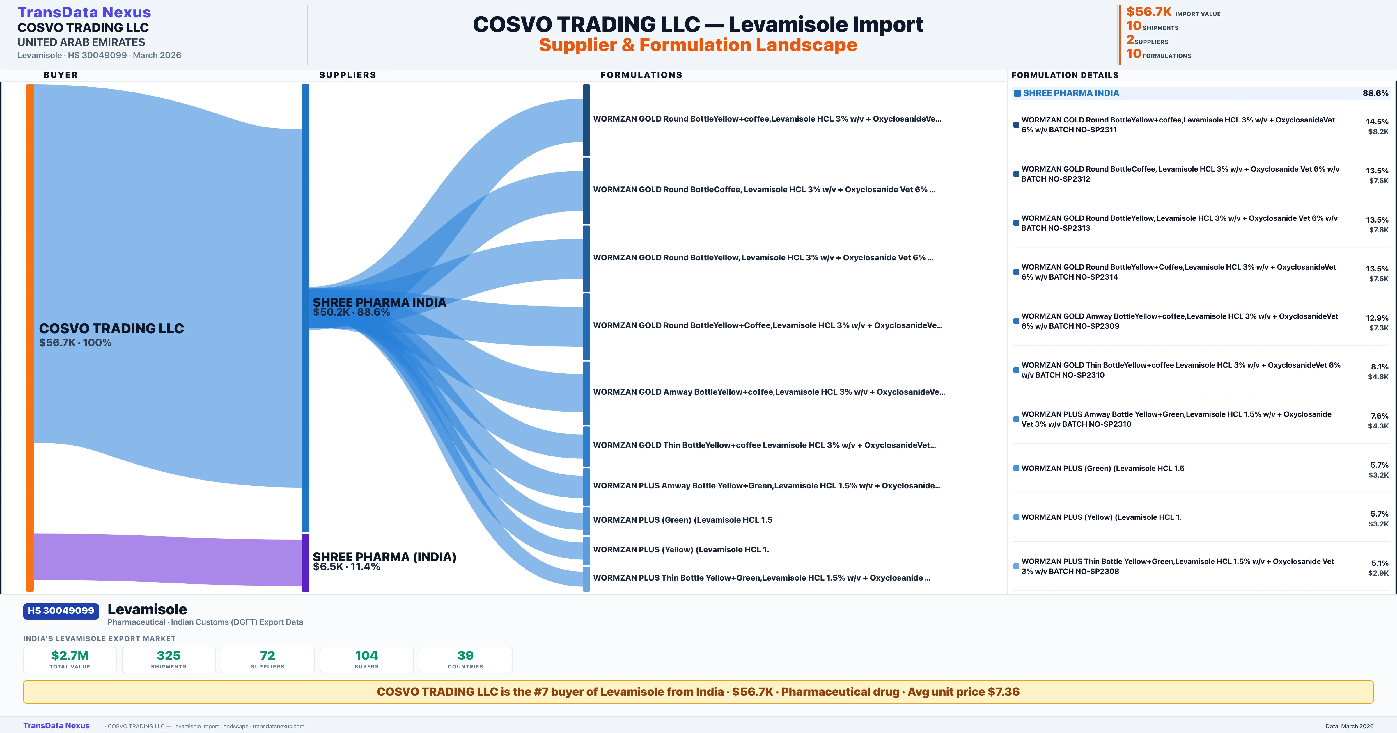 COSVO TRADING LLC sources Levamisole from 2 verified Indian suppliers: SHREE PHARMA INDIA ($50.2K, 88.6%), SHREE PHARMA (INDIA) ($6.5K, 11.4%). This is based on 10 customs records.