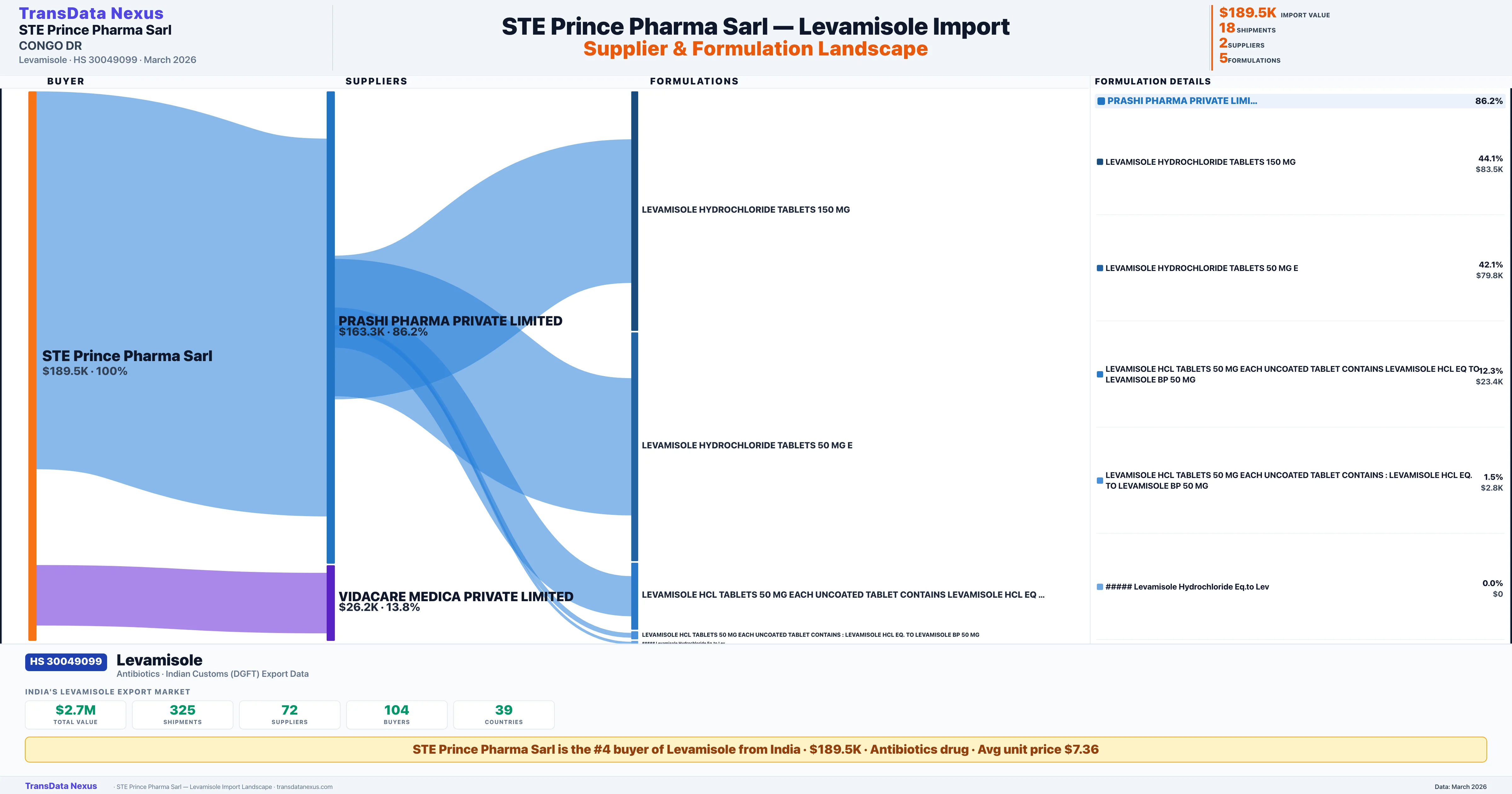 STE PRINCE PHARMA SARL sources Levamisole from 2 verified Indian suppliers based on 18 customs records. The primary supplier is PRASHI PHARMA PRIVATE LIMITED accounting for 86.2% of imports.