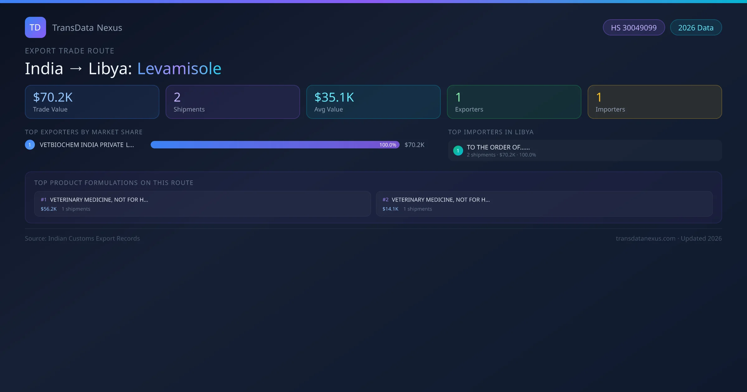 India has recorded 2 verified shipments of Levamisole exported to Libya, representing a combined trade value of $70.2K USD. This corridor is served by 1 active Indian exporters, with an average shipment value of $35.1K USD. The leading Indian exporter is VETBIOCHEM INDIA PRIVATE LIMITED, which accounts for 100% of total export value with 2 shipments worth $70.2K USD. On the buying side, TO THE ORDER OF...... is the largest importer in Libya with $70.2K USD in purchases. All data sourced from Indian Customs (DGFT) shipping bill records. Values reported in FOB USD.