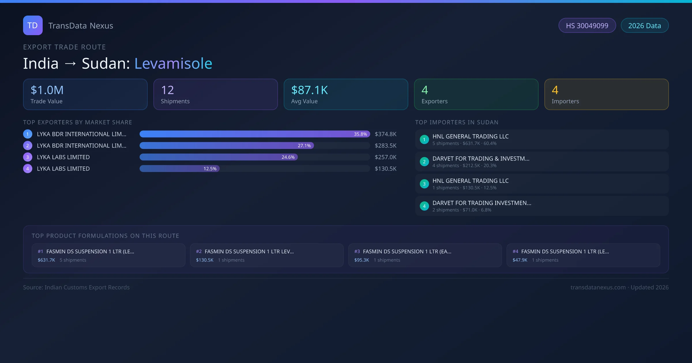- 1.Route Identification: India to Sudan export trade corridor identified from Indian Customs (DGFT) records for Levamisole.