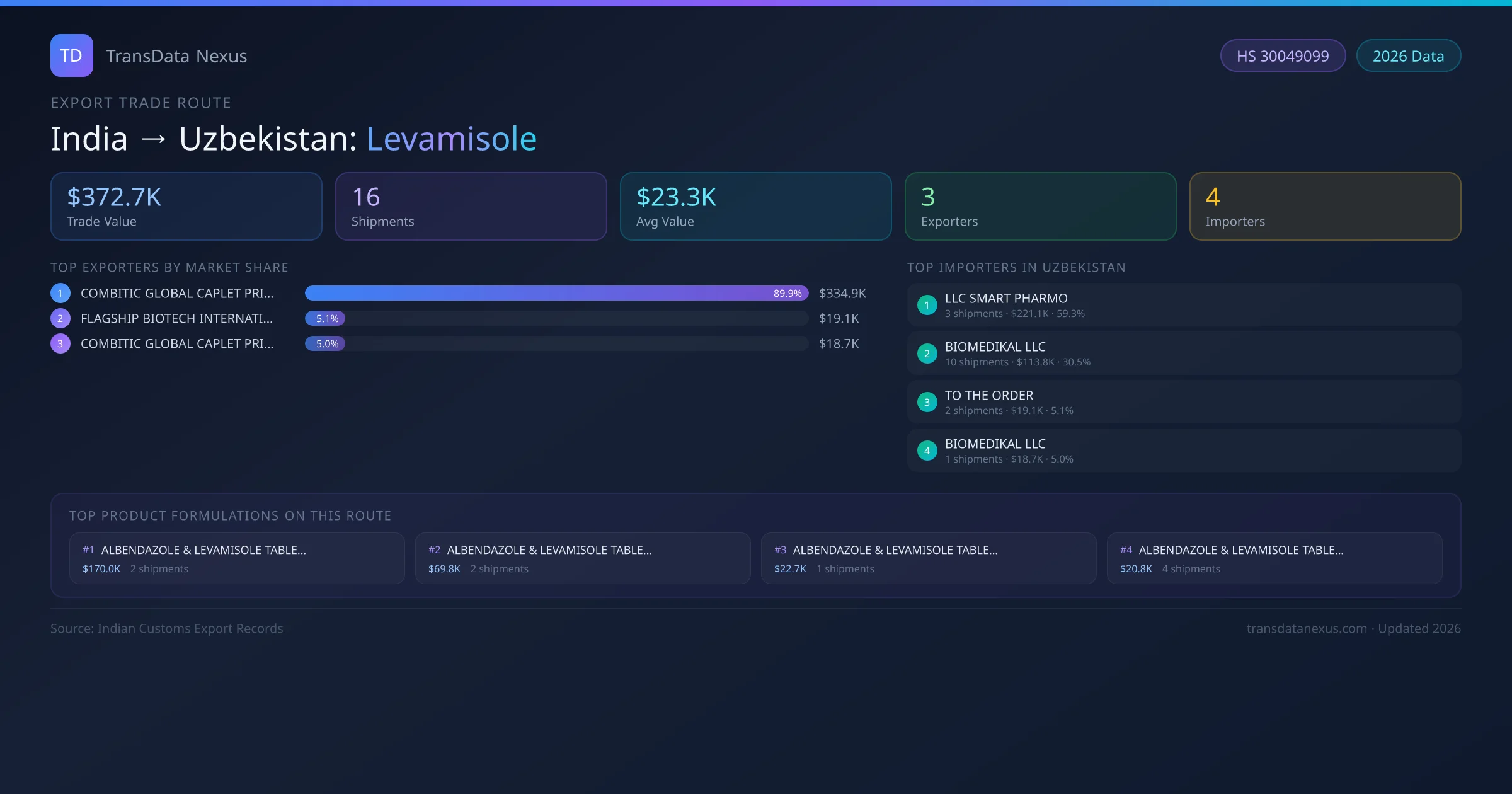 India has recorded 16 verified shipments of Levamisole exported to Uzbekistan, representing a combined trade value of $372.7K USD. This corridor is served by 3 active Indian exporters, with an average shipment value of $23.3K USD. The leading Indian exporter is COMBITIC GLOBAL CAPLET PRIVATE LIMITED, which accounts for 90% of total export value with 13 shipments worth $334.9K USD. On the buying side, LLC SMART PHARMO is the largest importer in Uzbekistan with $221.1K USD in purchases. The top 3 suppliers — COMBITIC GLOBAL CAPLET PRIVATE LIMITED, FLAGSHIP BIOTECH INTERNATIONAL PRIVATE LIMITED, COMBITIC GLOBAL CAPLET PRIVATE LIMITED — together control 100% of total trade value on this route. All data sourced from Indian Customs (DGFT) shipping bill records. Values reported in FOB USD.