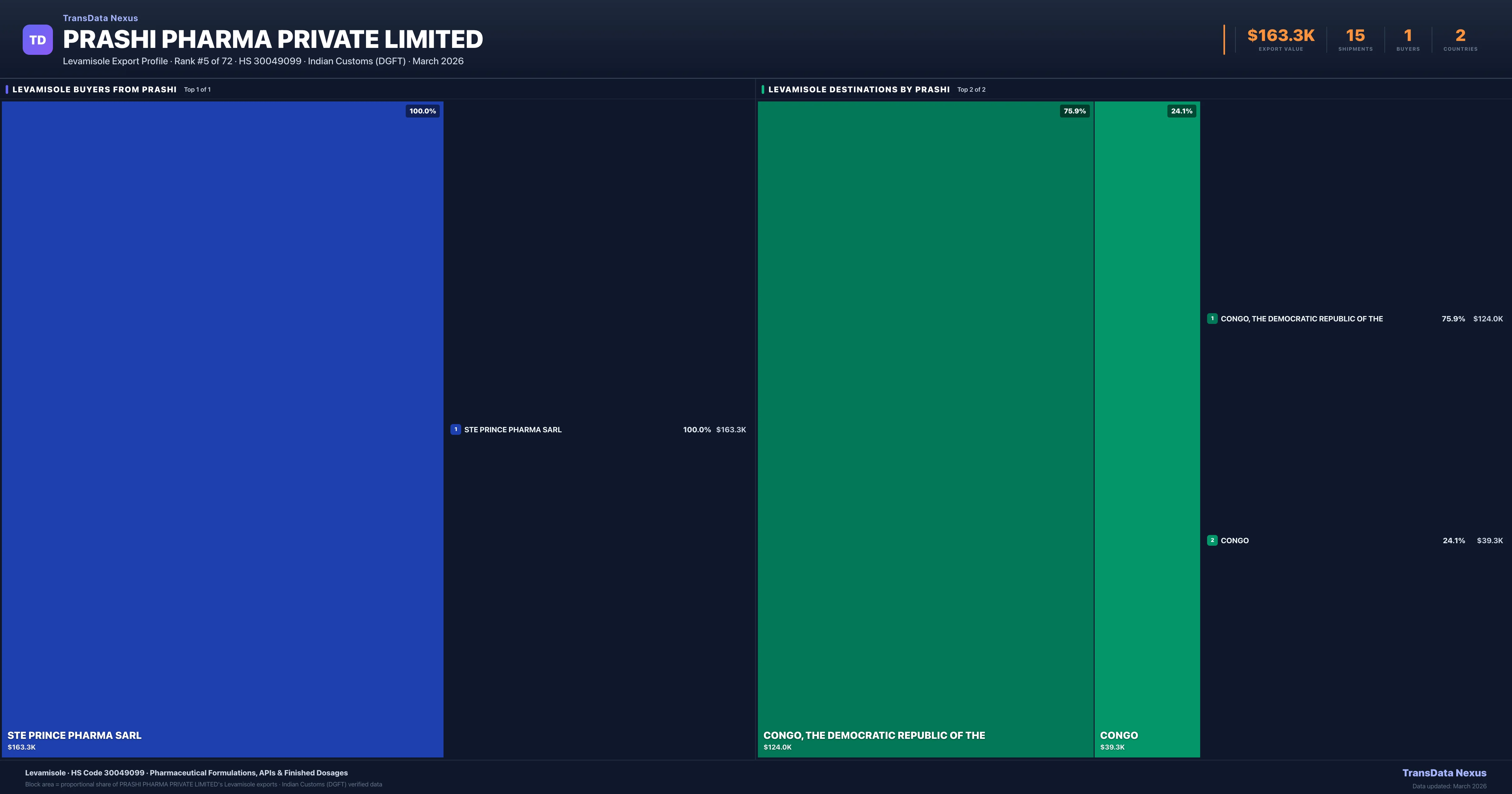 - 4.Verified Records: This page is backed by 15 individual customs records matching Prashi Pharma Private Limited exporting Levamisole, covering 3 formulations to 2 countries via 1 buyers.