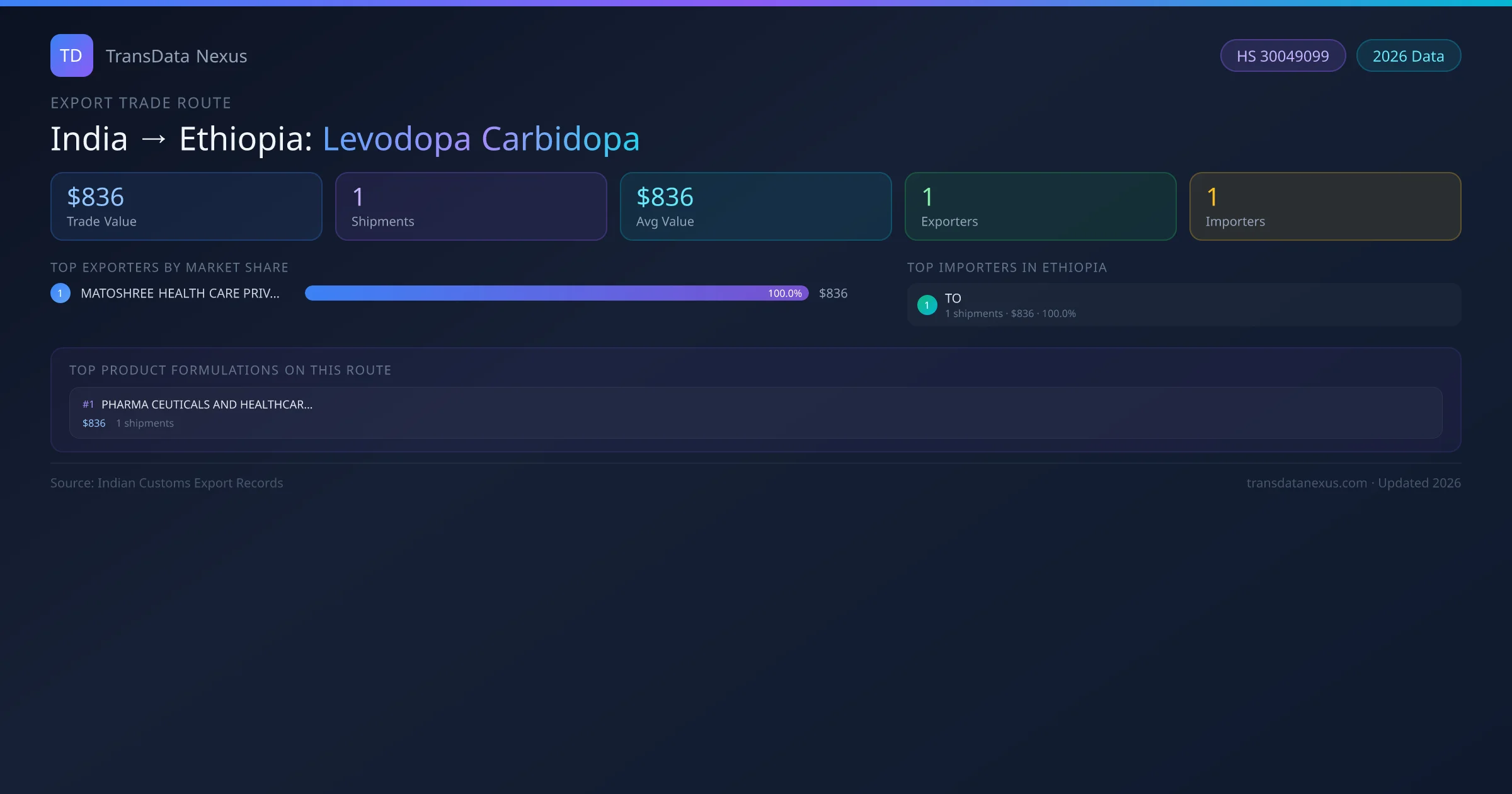 On the receiving end of this trade route, the leading importers of Indian levodopa carbidopa in Ethiopia include TO. The largest importer is TO, accounting for $836 USD across 1 shipments — representing 100% of all levodopa carbidopa imports from India on this route.
