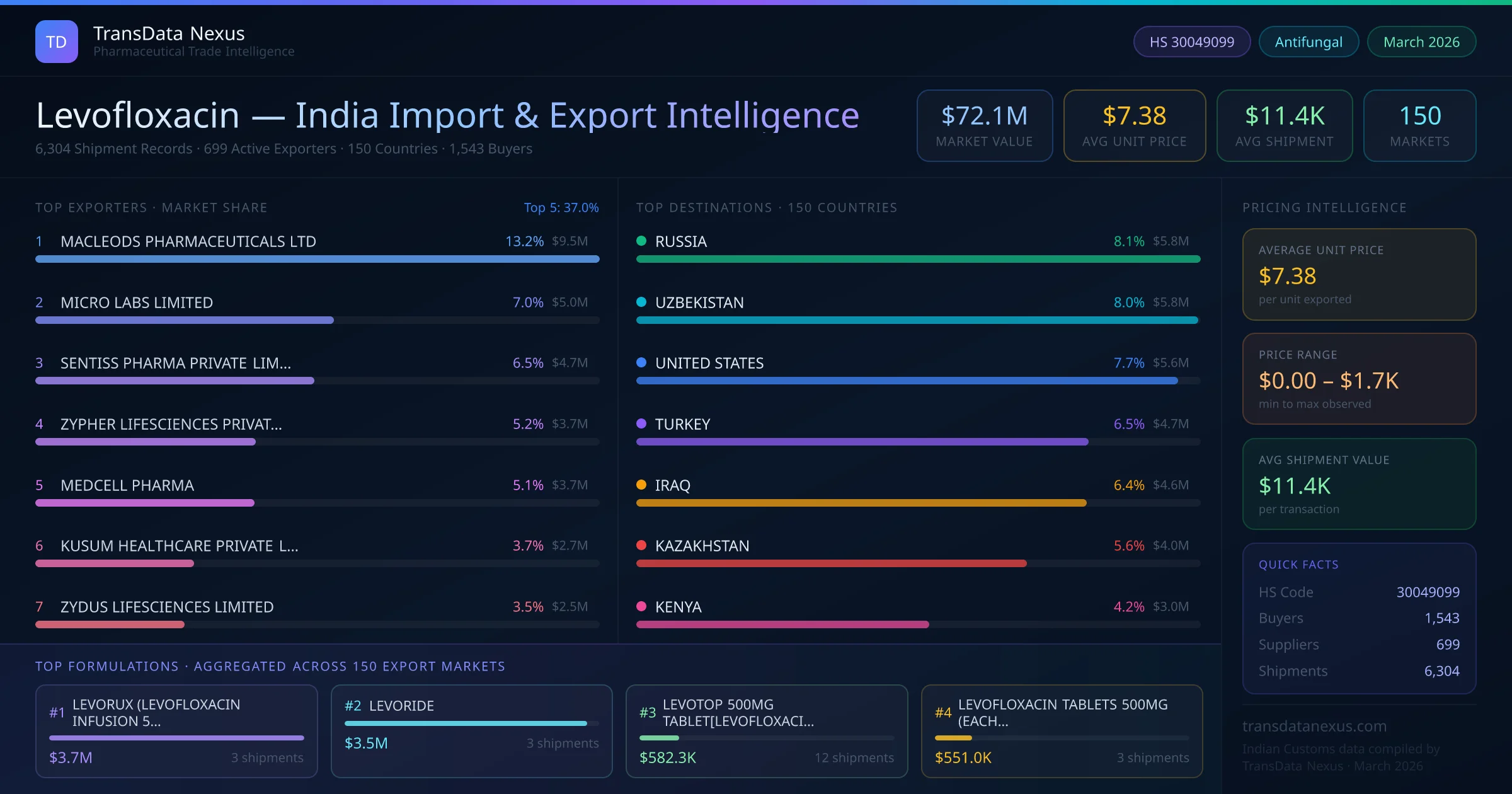 The total export value of levofloxacin from India is $72.1M, recorded across 6,304 shipments from 699 active exporters to 150 countries. The average shipment value is $11.4K.