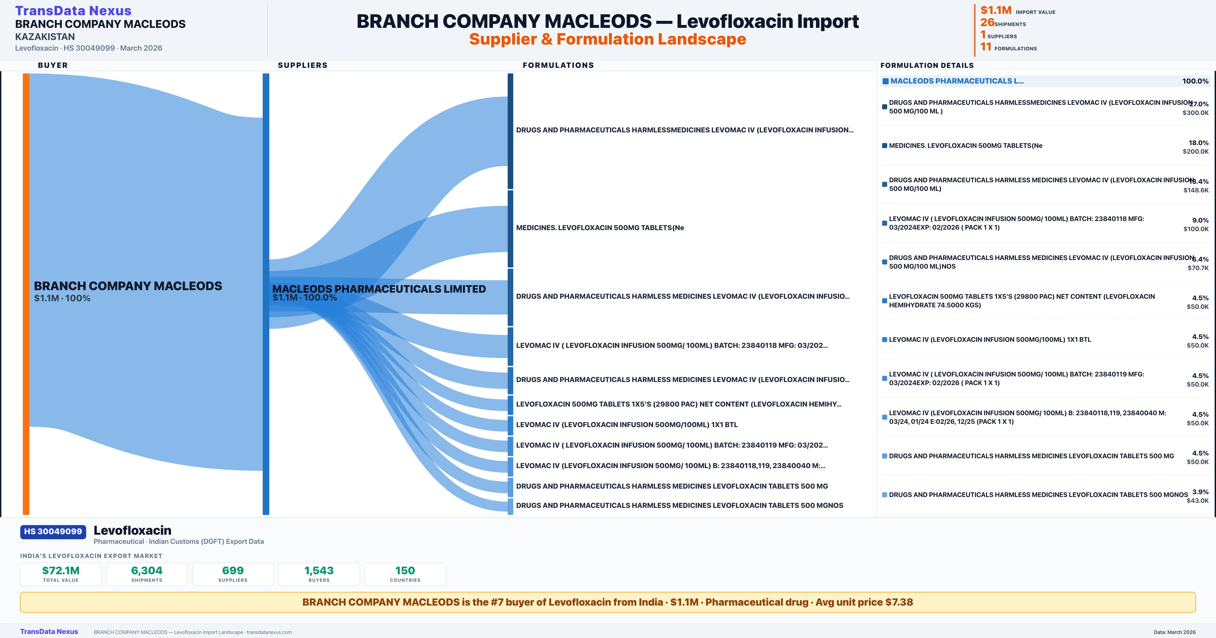 BRANCH COMPANY MACLEODS sources Levofloxacin from 1 verified Indian supplier: MACLEODS PHARMACEUTICALS LIMITED ($1.1M, 100.0%). This is based on 26 customs records.
