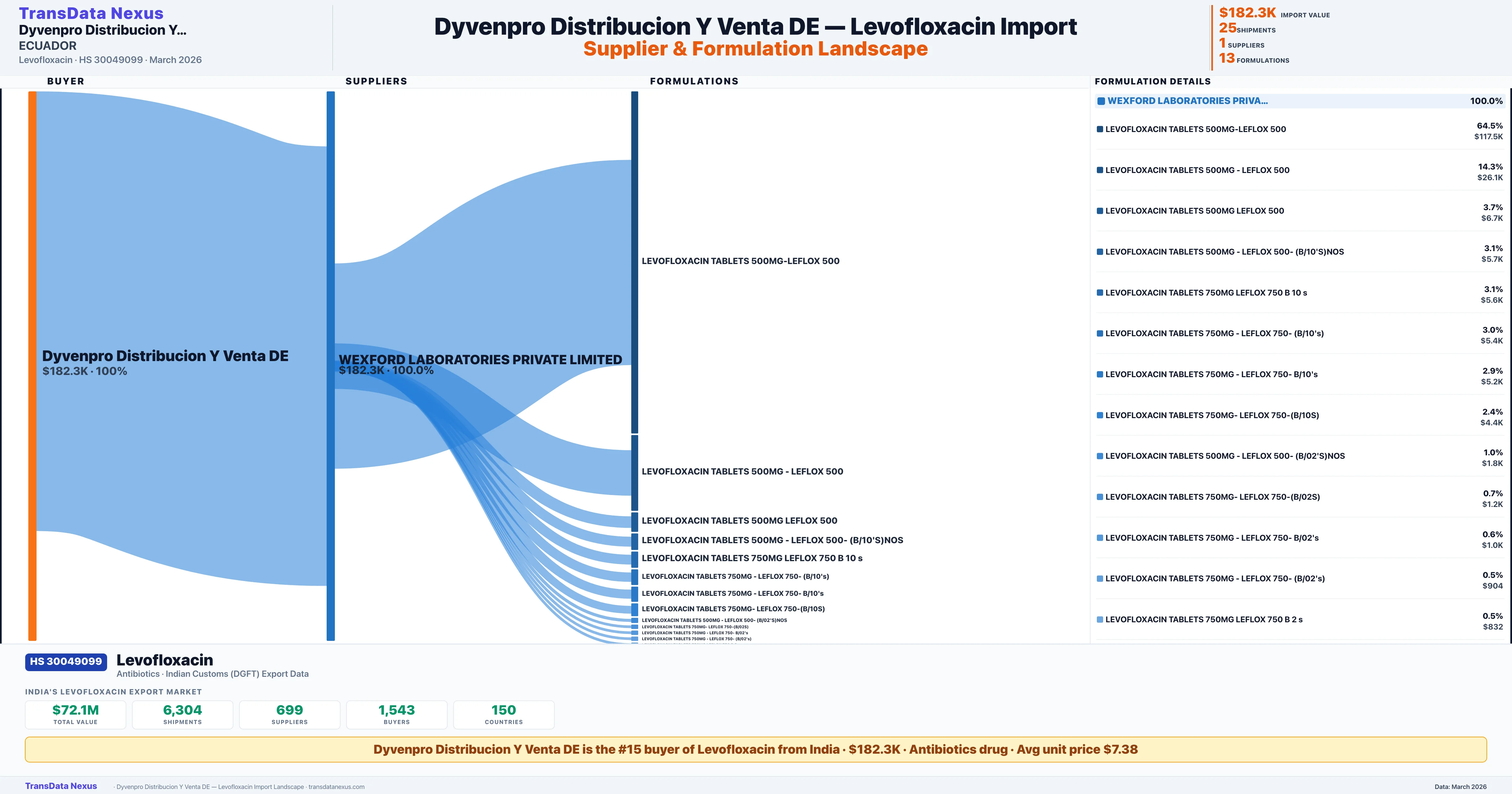 DYVENPRO DISTRIBUCION Y VENTA DE sources Levofloxacin from 1 verified Indian supplier: WEXFORD LABORATORIES PRIVATE LIMITED ($182.3K, 100.0%). This is based on 25 customs records.