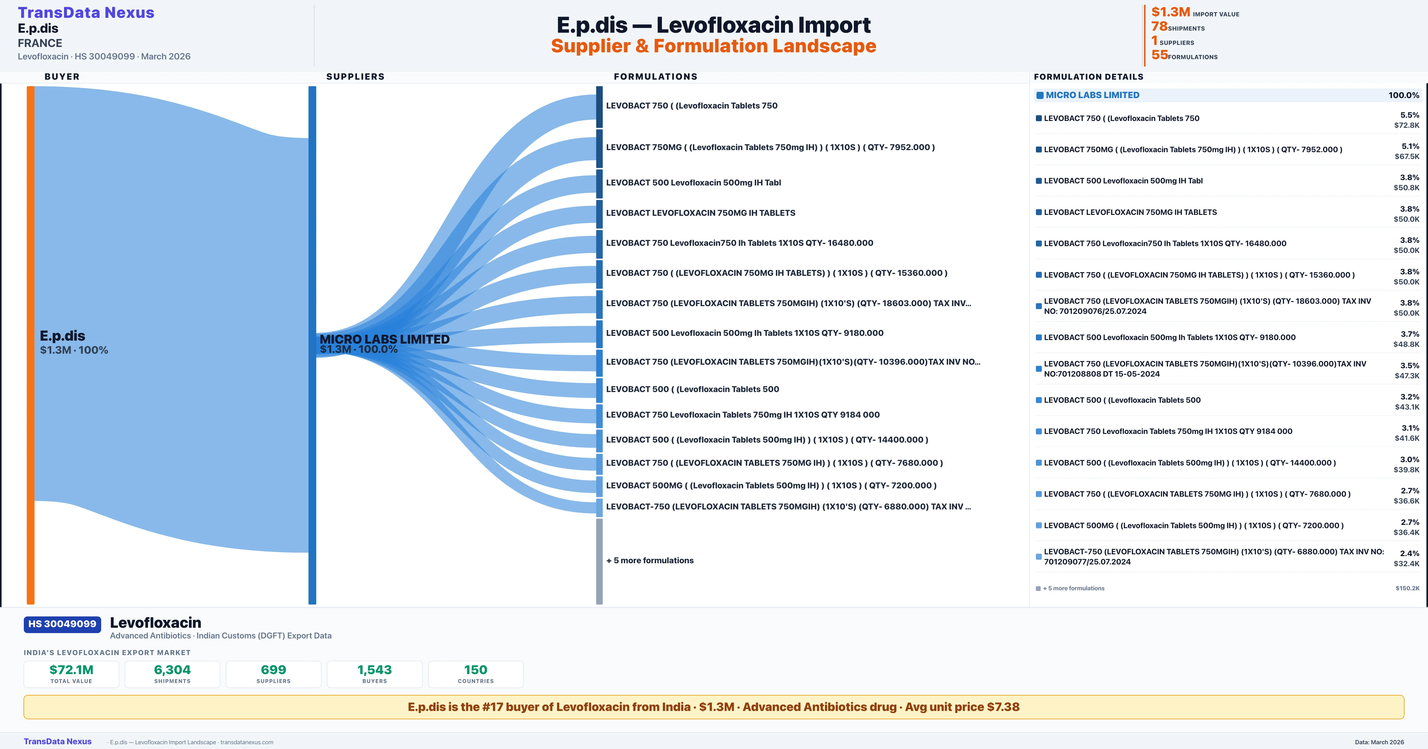 E.P.DIS sources Levofloxacin from 1 verified Indian supplier: MICRO LABS LIMITED ($1.3M, 100.0%). This is based on 78 customs records.