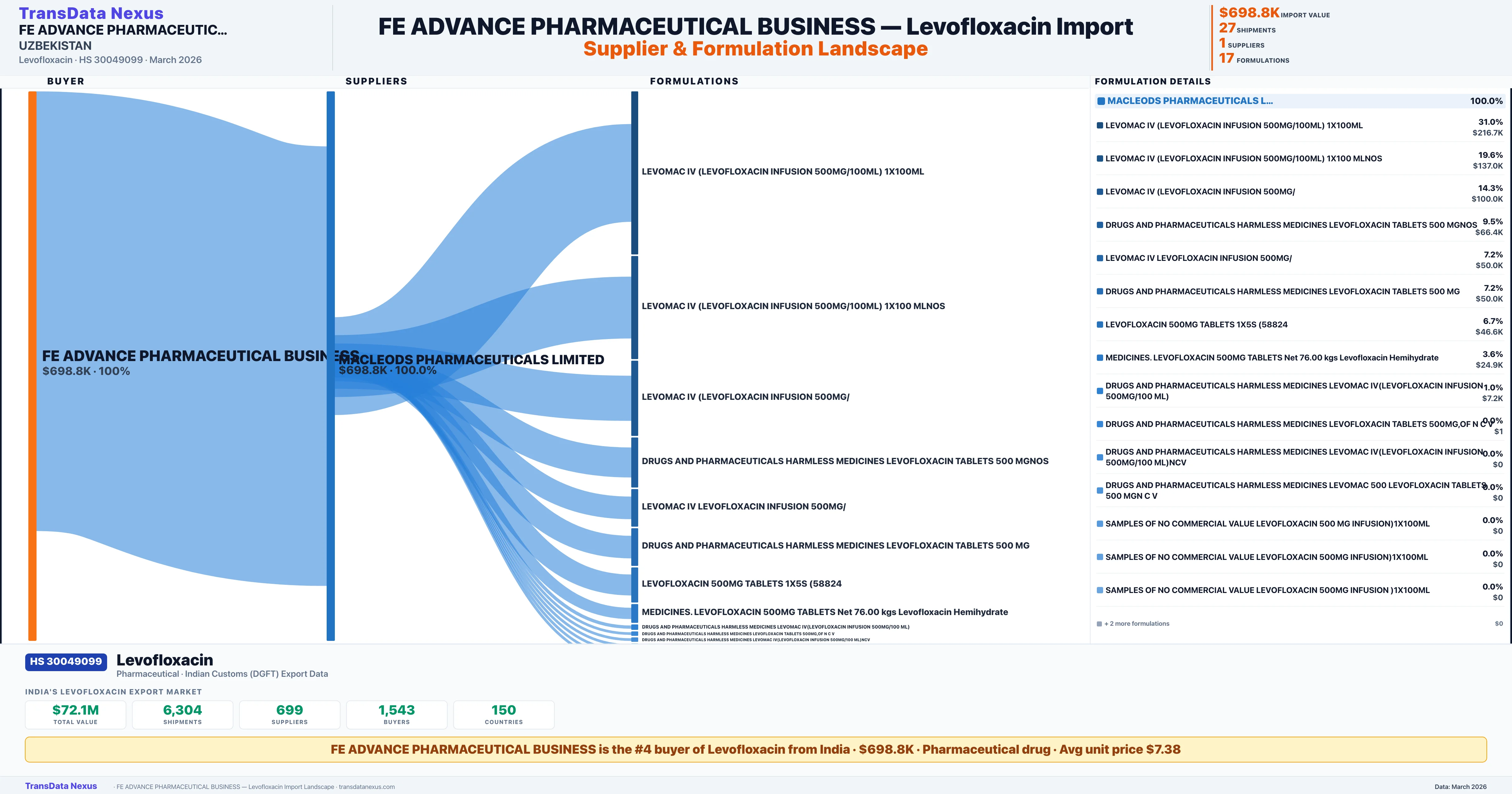 FE ADVANCE PHARMACEUTICAL BUSINESS sources Levofloxacin from 1 verified Indian supplier: MACLEODS PHARMACEUTICALS LIMITED ($698.8K, 100.0%). This is based on 27 customs records.