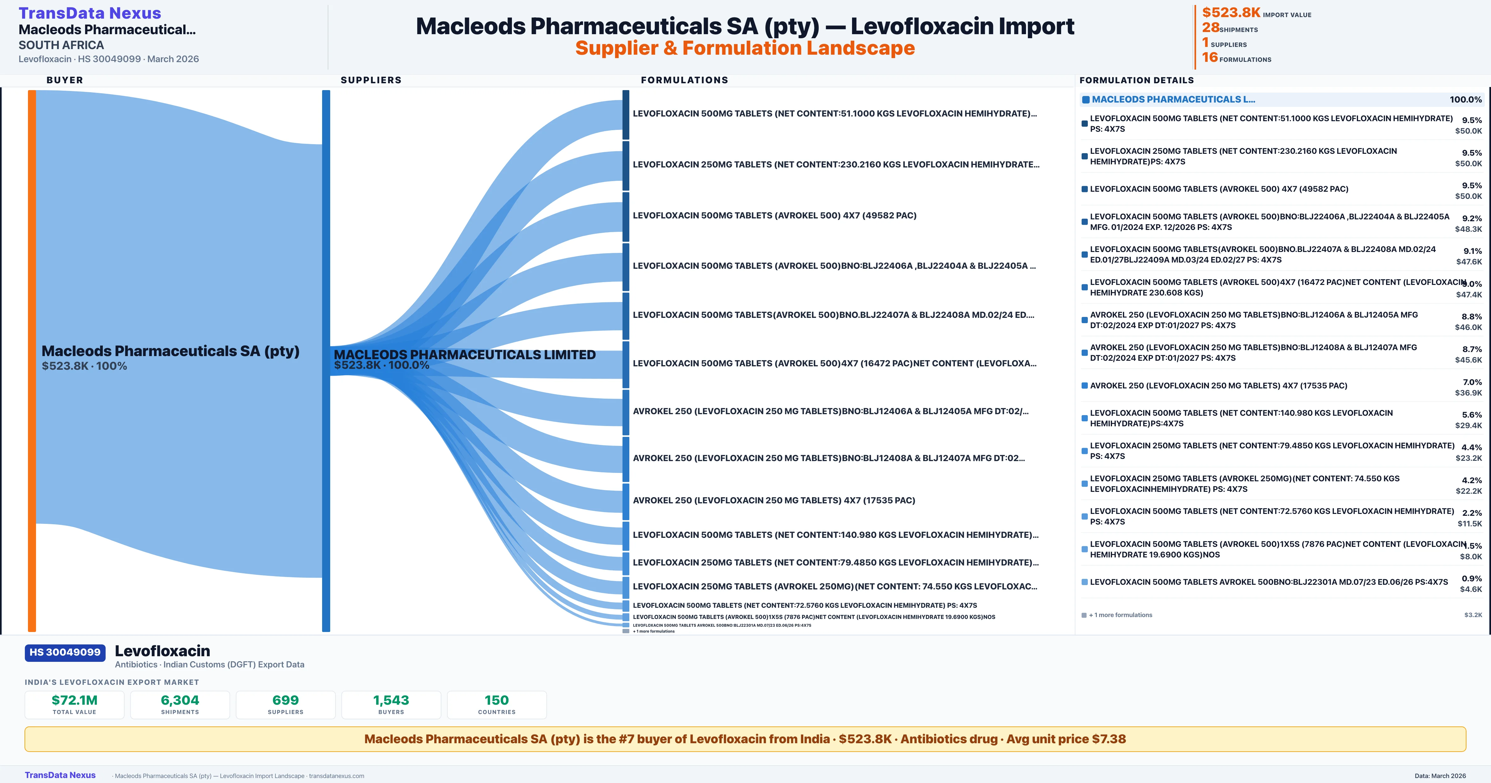 MACLEODS PHARMACEUTICALS SA (PTY) sources Levofloxacin from 1 verified Indian supplier: MACLEODS PHARMACEUTICALS LIMITED ($523.8K, 100.0%). This is based on 28 customs records.