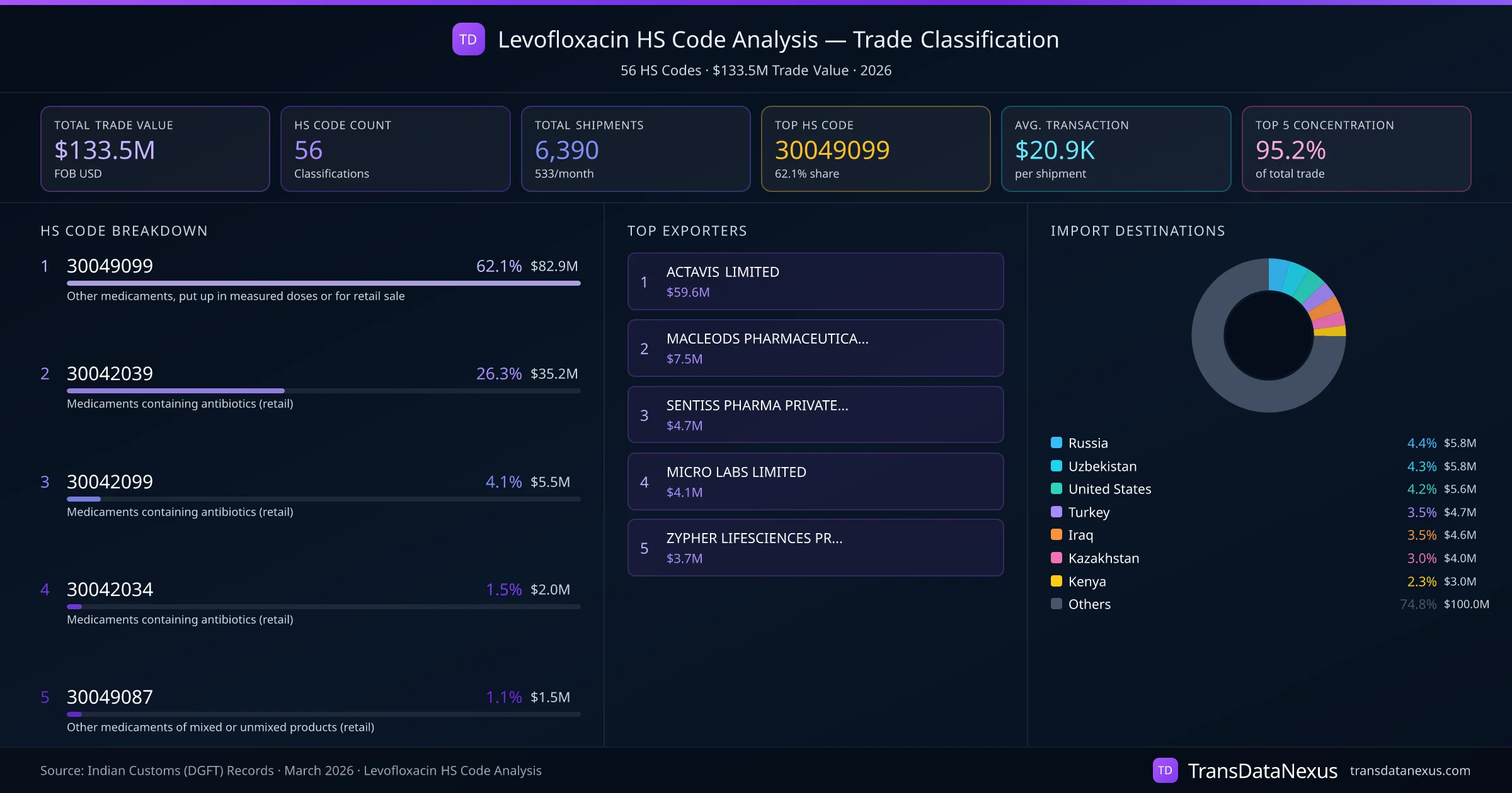 India exports Levofloxacin under 56 distinct HS code classifications, representing a total trade value of $133.5M across 6,390 shipments. The dominant classification is HS 30049099 (Other medicaments, put up in measured doses or for retail sale), accounting for 62.1% of all Levofloxacin trade at $82.9M. HS 30042039 (Medicaments containing antibiotics (retail)) follows at 26.3% ($35.2M). The top 5 HS codes together account for 95.2% of total Levofloxacin trade from India. The average transaction value is $20899. Key importing markets include Russia, Uzbekistan, United States. Leading exporters include ACTAVIS LIMITED and MACLEODS PHARMACEUTICALS LTD. Data sourced from Indian Customs (DGFT) shipping bill records.