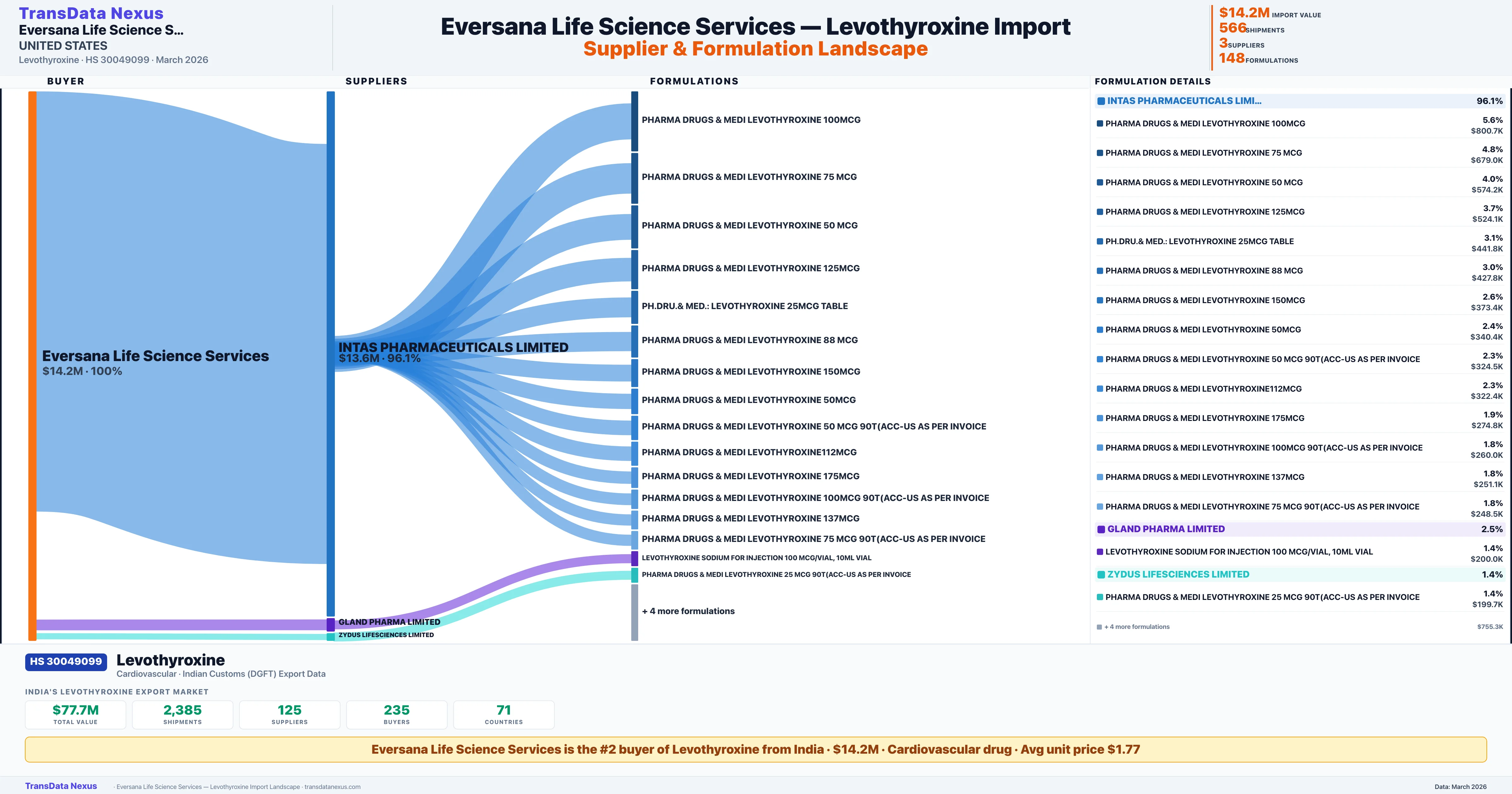 EVERSANA LIFE SCIENCE SERVICES imports 148 distinct Levothyroxine formulations from India. The top formulation is PHARMA DRUGS & MEDI LEVOTHYROXINE 100MCG with 21 shipments worth $800.7K.