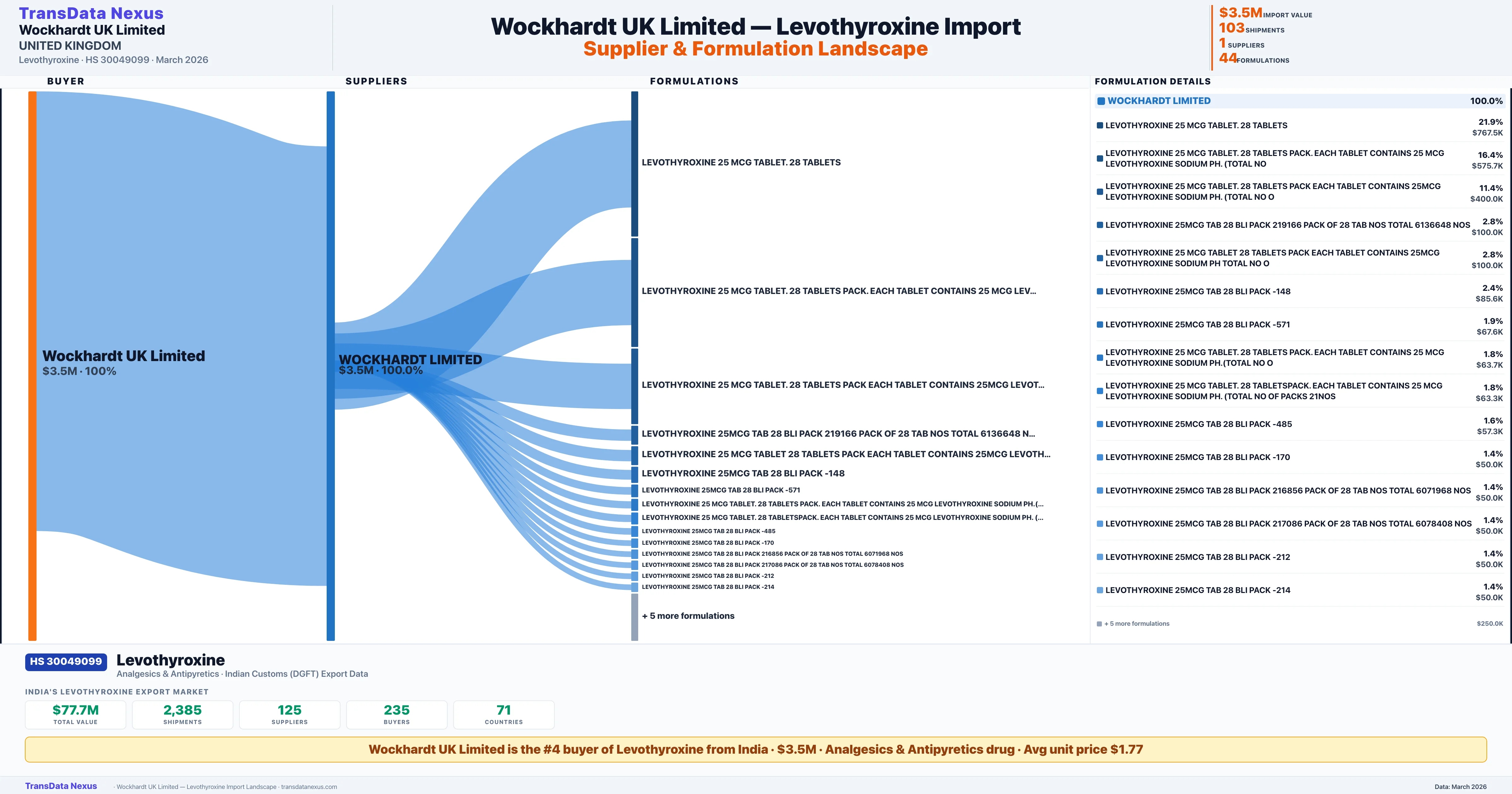 WOCKHARDT UK LIMITED sources Levothyroxine from 1 verified Indian supplier: WOCKHARDT LIMITED ($3.5M, 100.0%). This is based on 103 customs records.