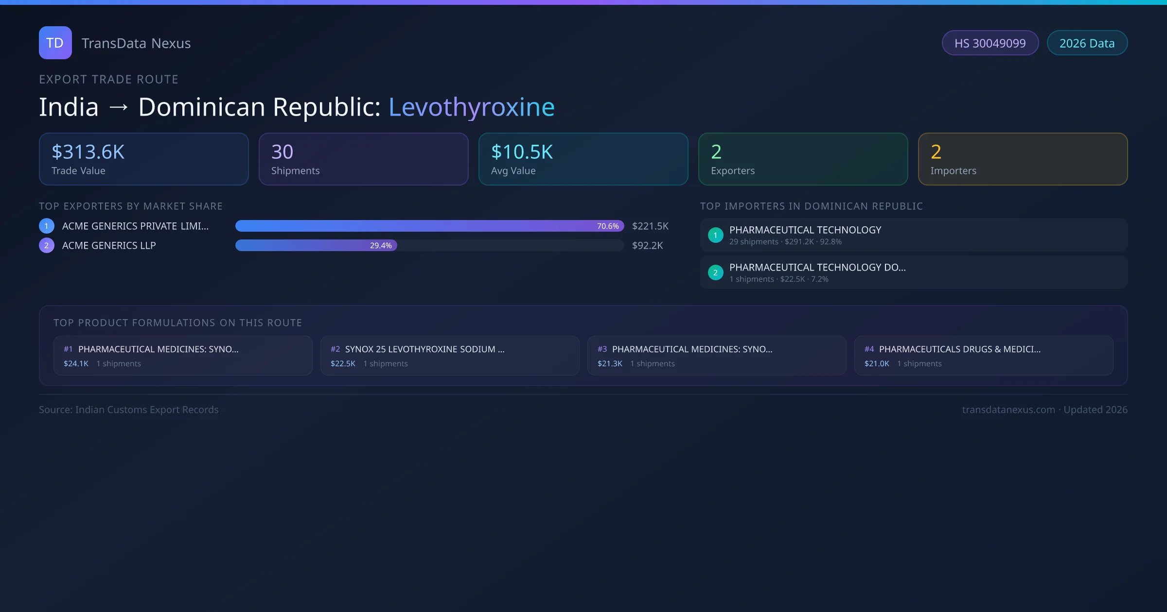 - 1.Route Identification: India to Dominican Republic export trade corridor identified from Indian Customs (DGFT) records for Levothyroxine.
