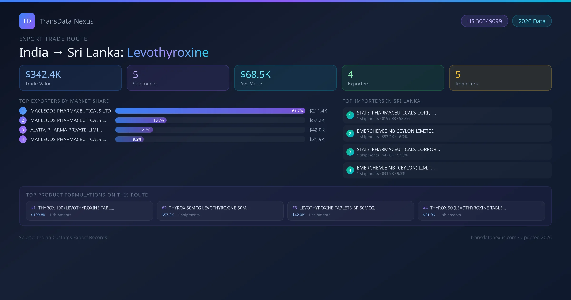 The India to Sri Lanka Levothyroxine corridor is one of India's established pharmaceutical export routes, with 5 shipments documented worth a combined $342.4K USD. The route is dominated by MACLEODS PHARMACEUTICALS LTD, which alone accounts for roughly 62% of all export value, reflecting the consolidated nature of India's levothyroxine manufacturing sector.