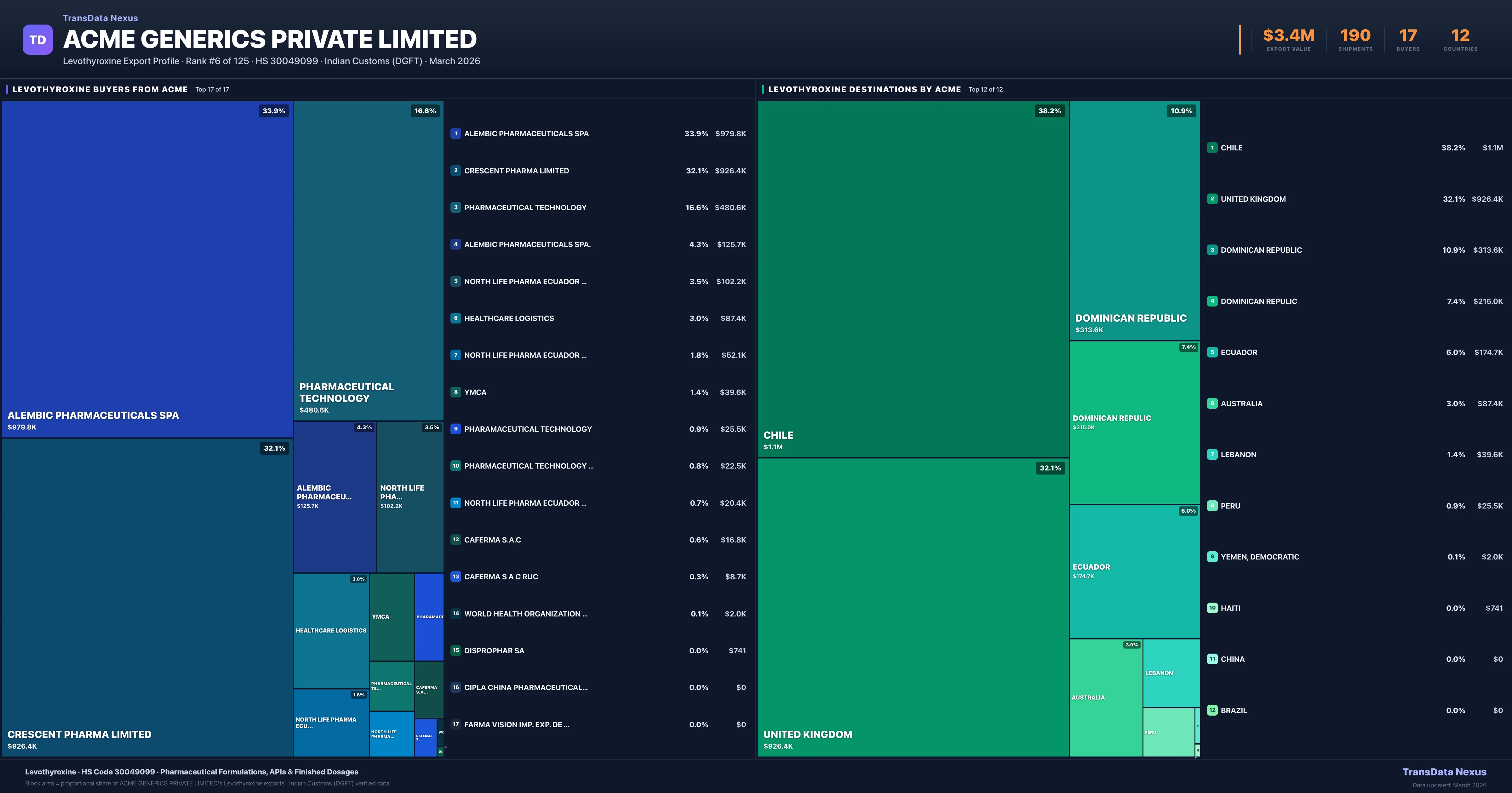 Acme Generics Private Limited supplies Levothyroxine to 17 buyers globally. The largest buyer is ALEMBIC PHARMACEUTICALS SPA (CHILE), followed by CRESCENT PHARMA LIMITED (UNITED KINGDOM) and PHARMACEUTICAL TECHNOLOGY (DOMINICAN REPUBLIC). These buyers represent pharmaceutical distributors, hospital groups, and government procurement agencies in their respective markets.
