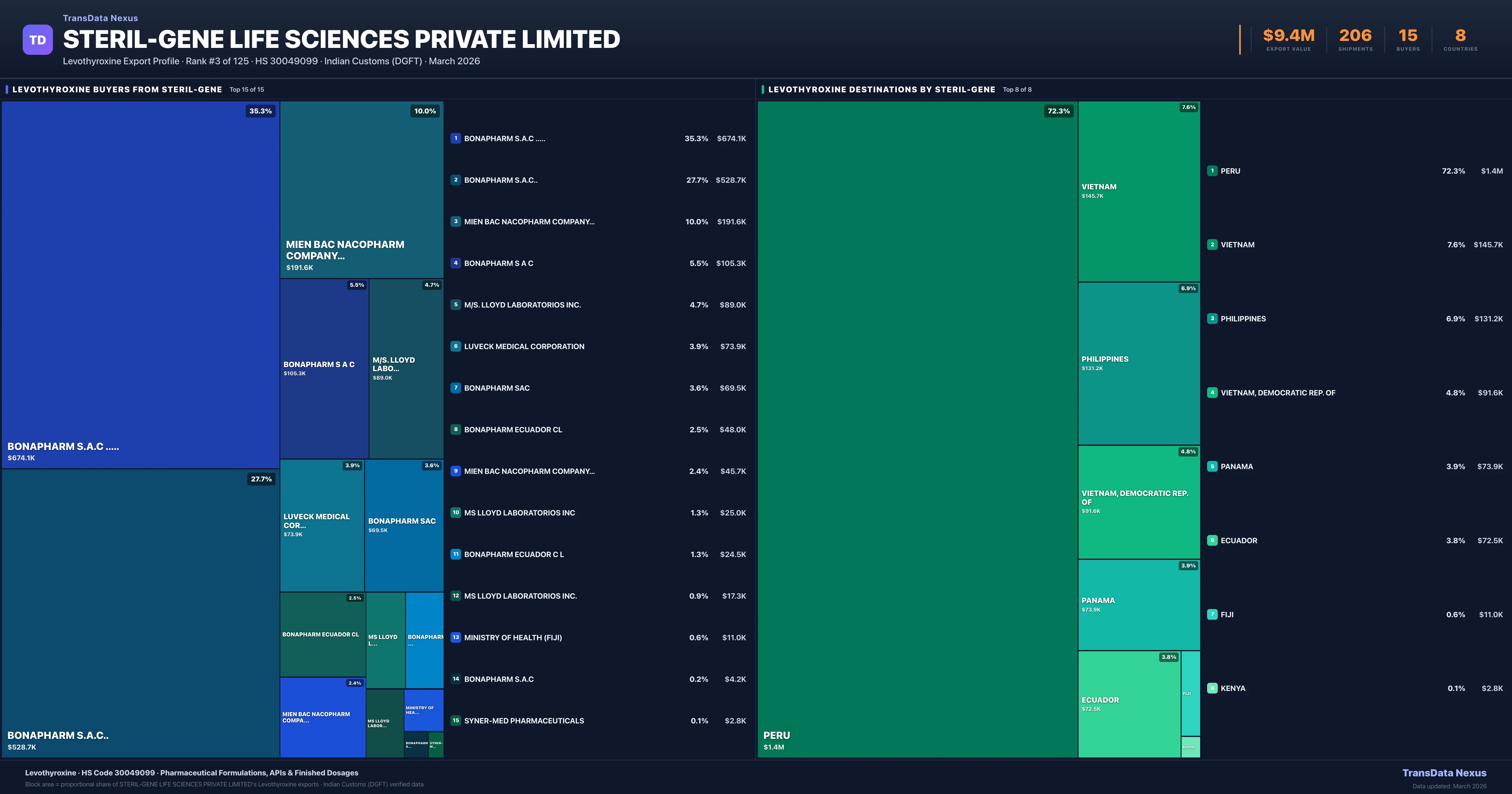 Steril-gene Life Sciences Private Limited supplies Levothyroxine to 15 buyers globally. The largest buyer is BONAPHARM S.A.C ..... (PERU), followed by BONAPHARM S.A.C.. (PERU) and MIEN BAC NACOPHARM COMPANY LTD (VIETNAM, DEMOCRATIC REP. OF). These buyers represent pharmaceutical distributors, hospital groups, and government procurement agencies in their respective markets.