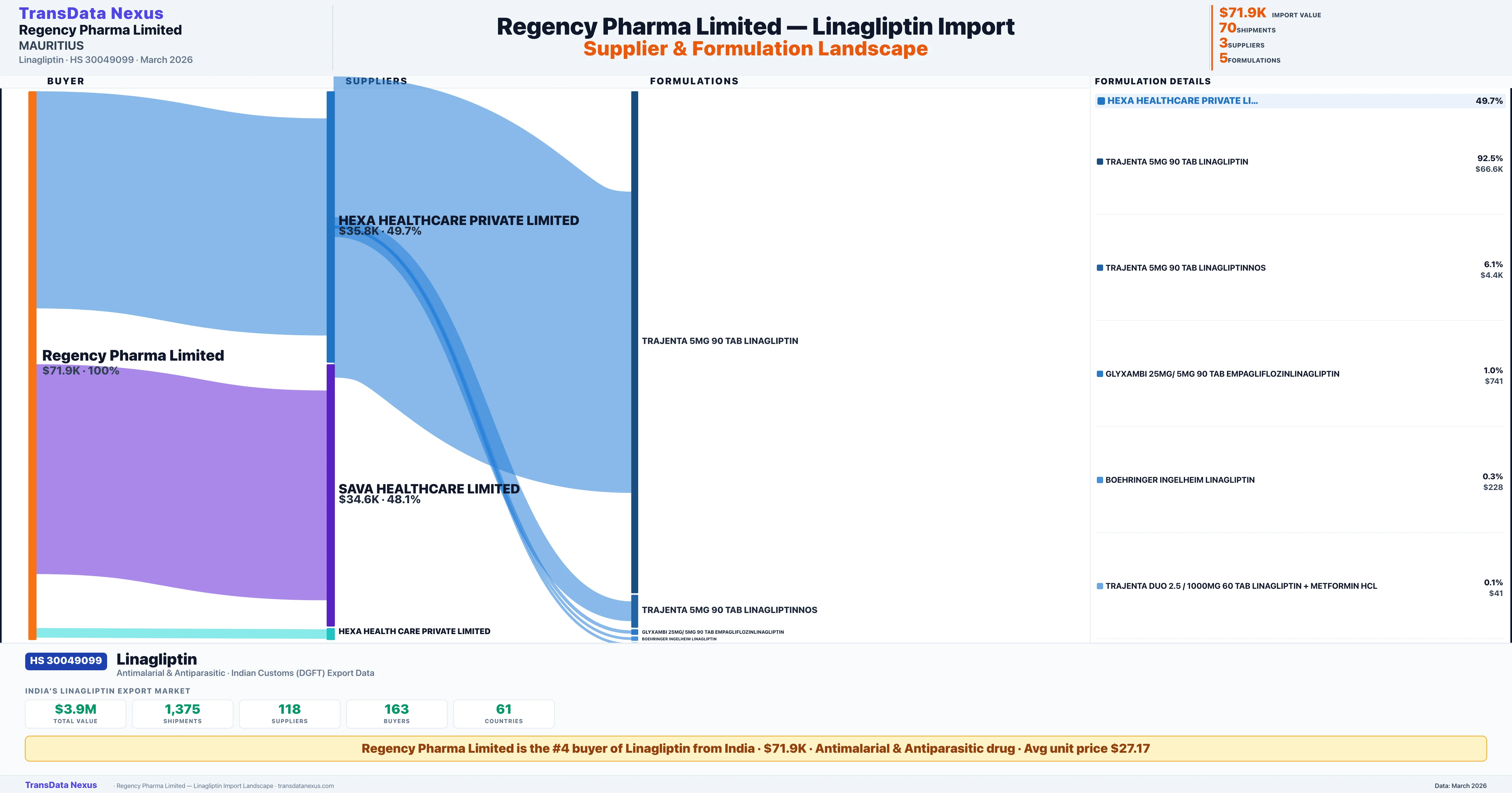 REGENCY PHARMA LIMITED sources Linagliptin from 3 verified Indian suppliers: HEXA HEALTHCARE PRIVATE LIMITED ($35.8K, 49.7%), SAVA HEALTHCARE LIMITED ($34.6K, 48.1%), HEXA HEALTH CARE PRIVATE LIMITED ($1.6K, 2.2%). This is based on 70 customs records.